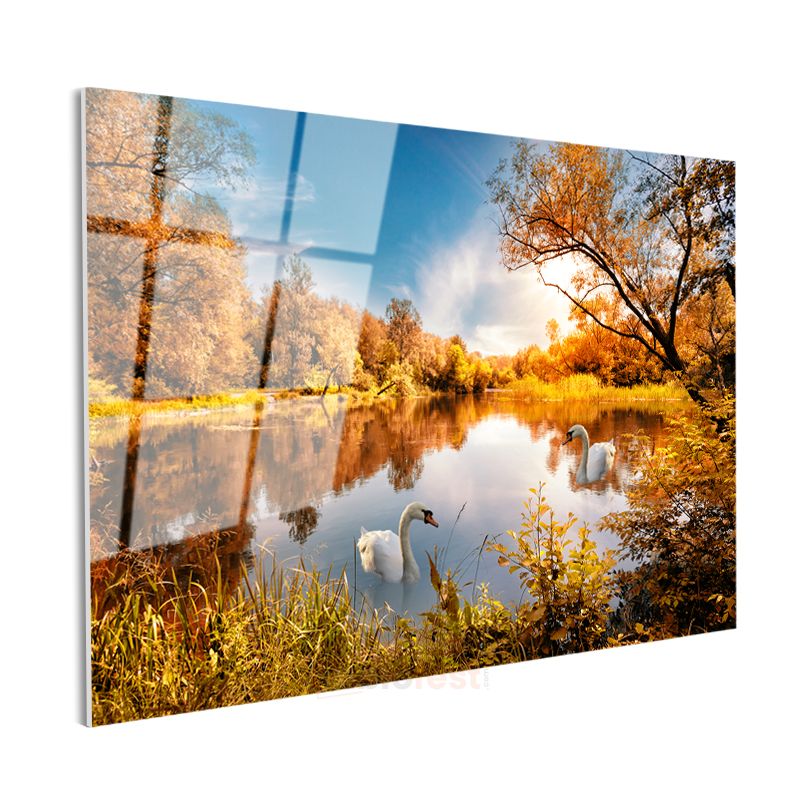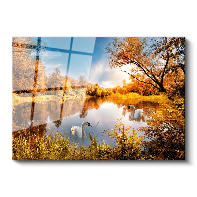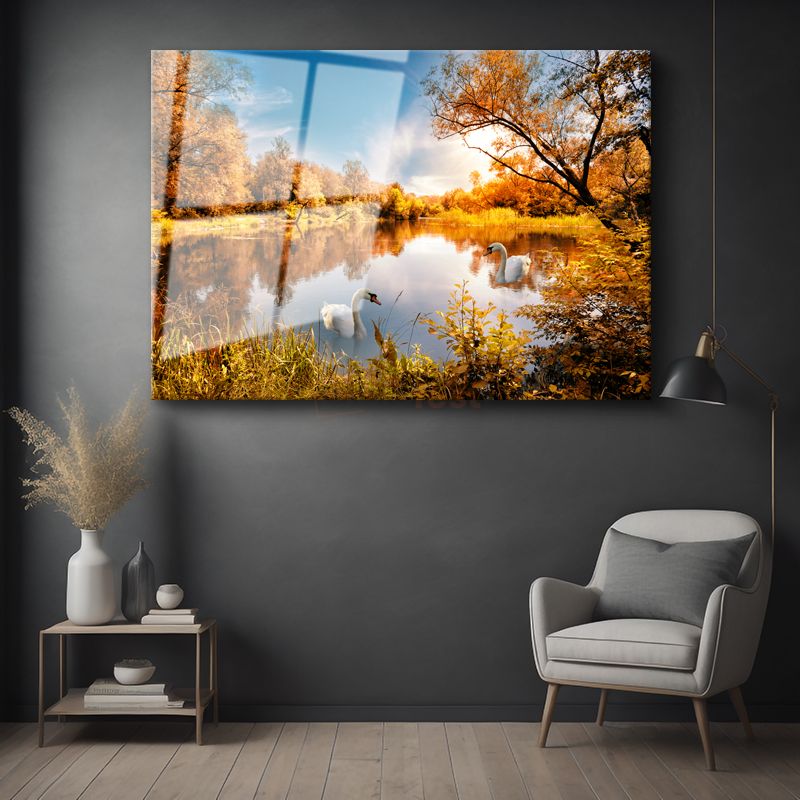 Sonbahar Kuğuları - Altın Yapraklı Ağaçlar Arasında Huzurlu Göl Cam Tablo