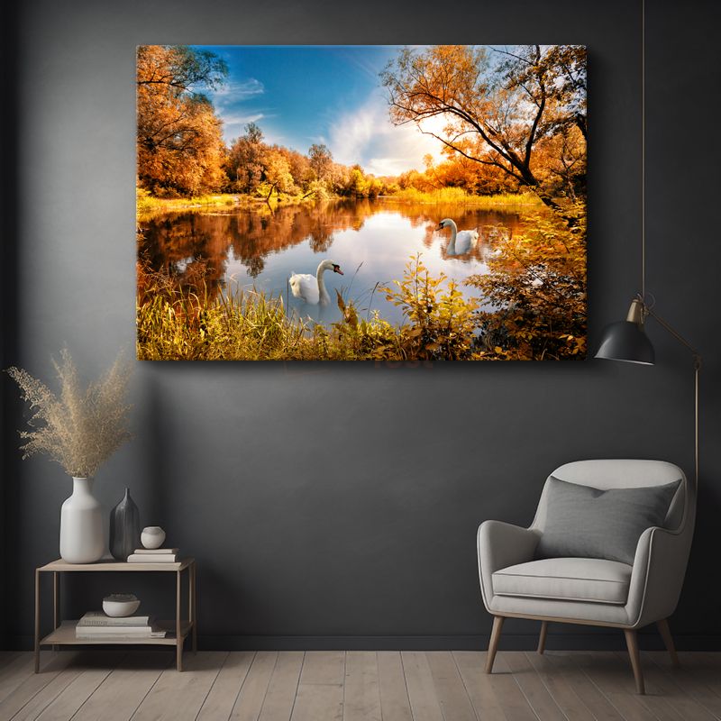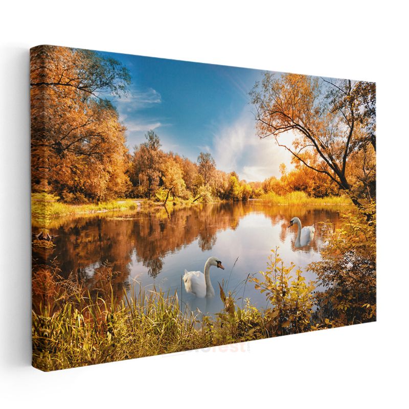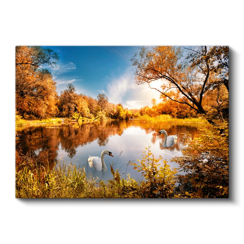 Sonbahar Kuğuları - Altın Yapraklı Ağaçlar Arasında Huzurlu Göl Kanvas Tablo