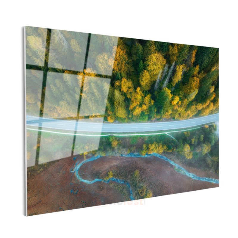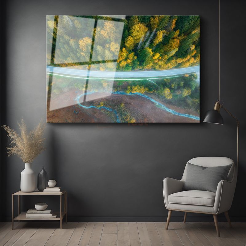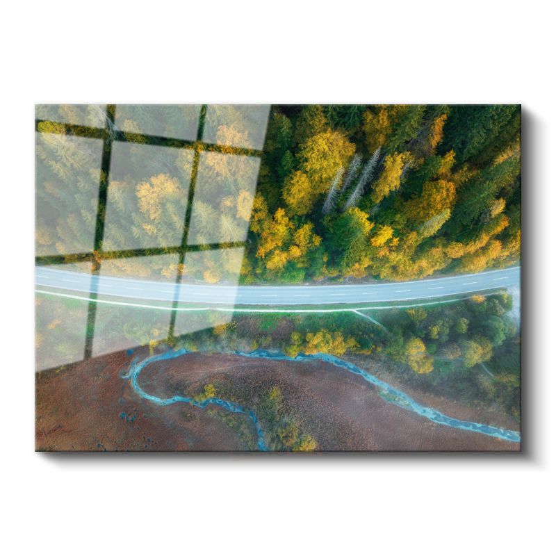 Sonbahar Manzarası - Havadan Görünen Altın Sarısı Orman ve Mavi Nehir Cam Tablo
