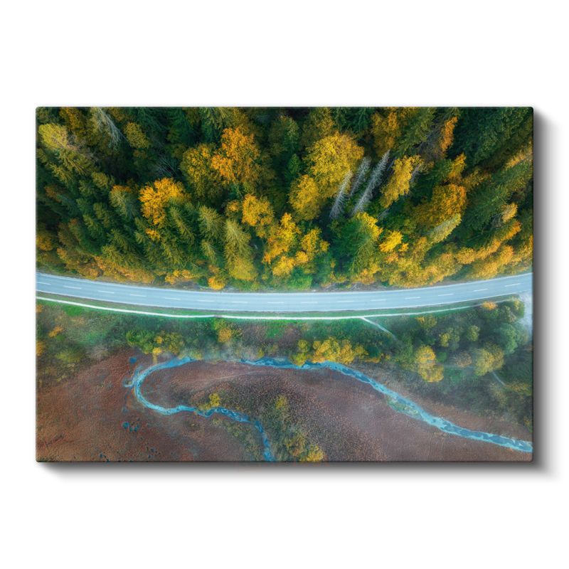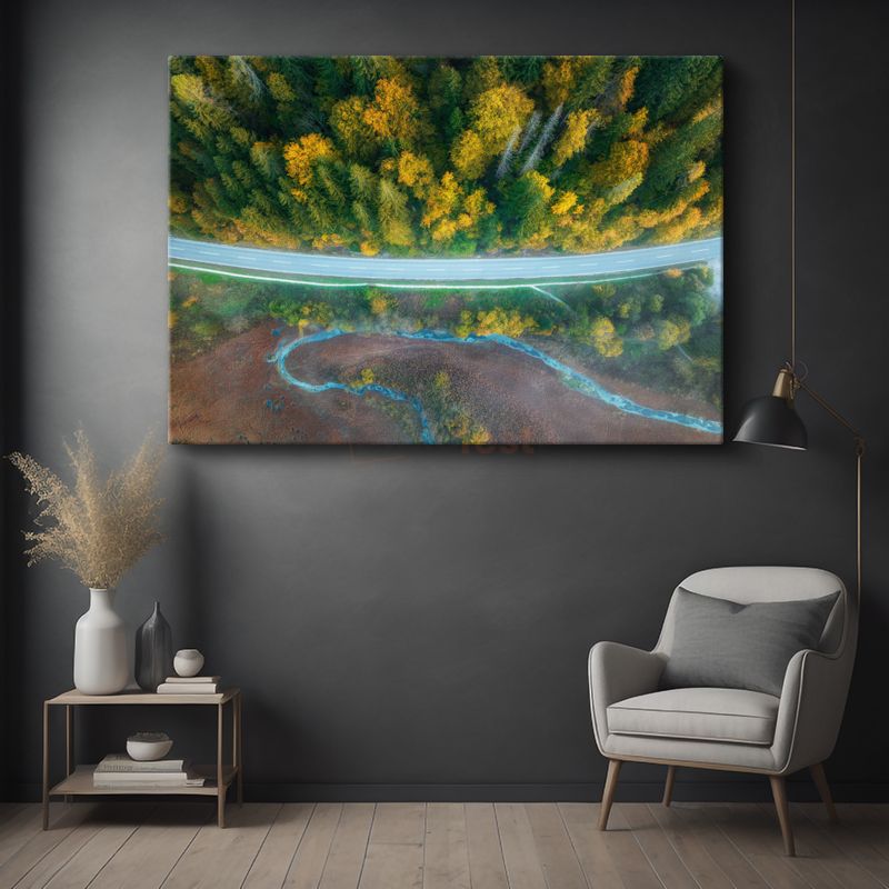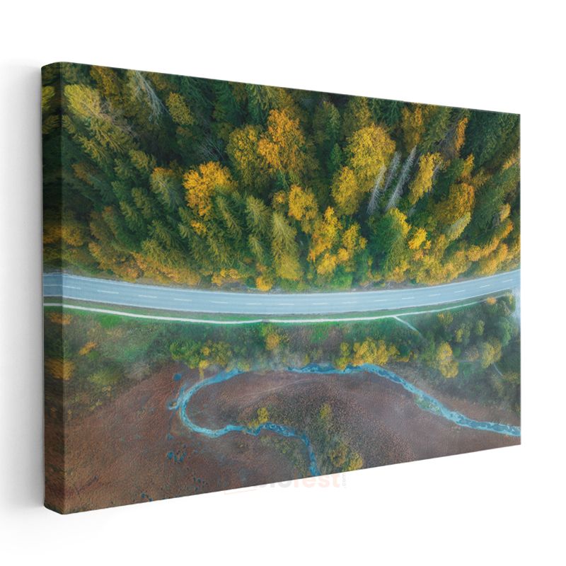 Sonbahar Manzarası - Havadan Görünen Altın Sarısı Orman ve Mavi Nehir Kanvas Tablo