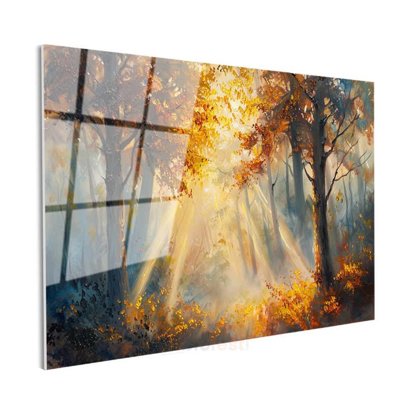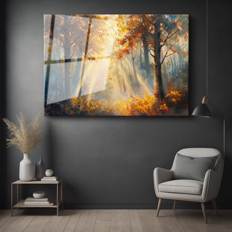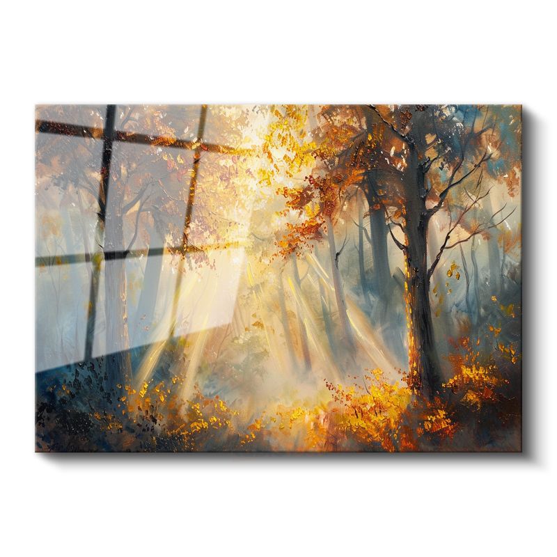 Sonbahar Ormanı - Altın Yapraklar Arasından Süzülen Güneş Işınları Cam Tablo