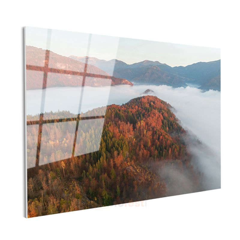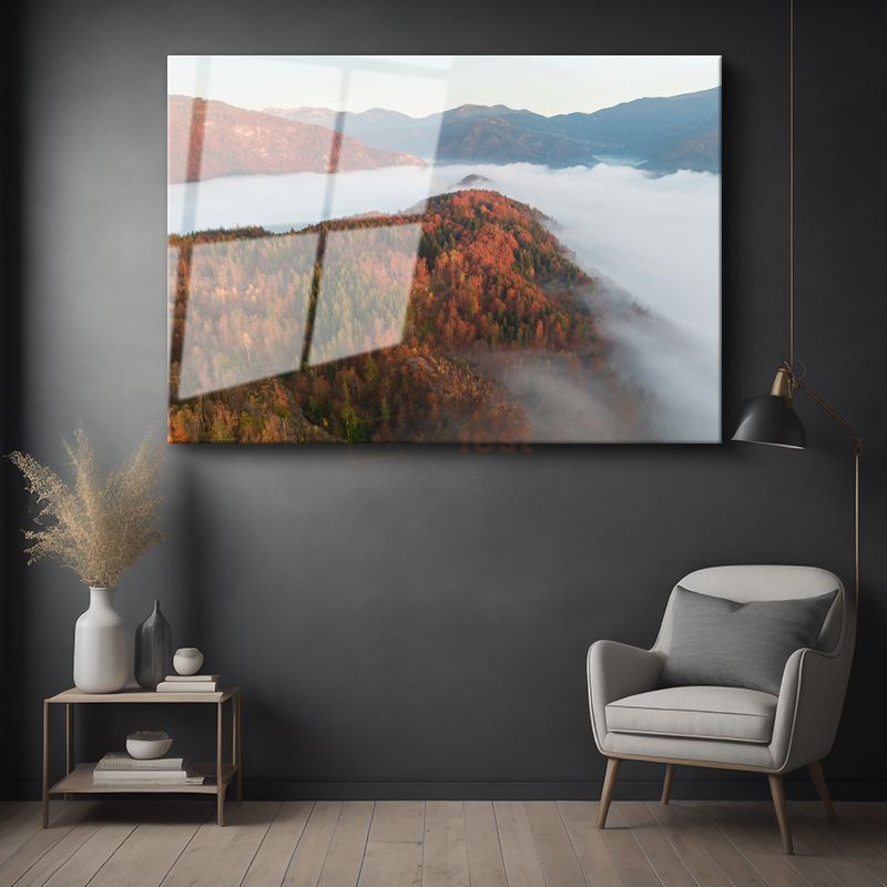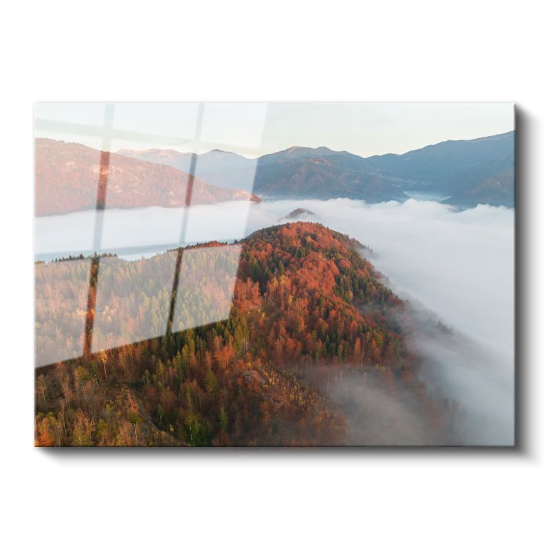 Sonbahar Ormanı - Sis Örtüsü Altında Kızıl Ağaçlar Cam Tablo
