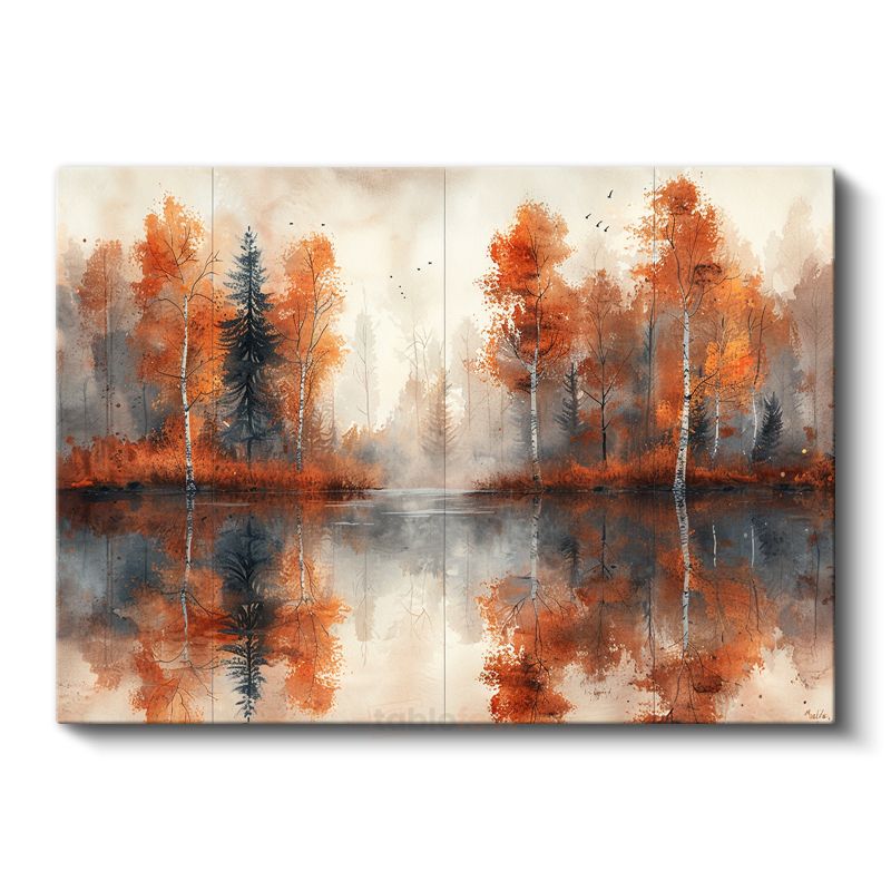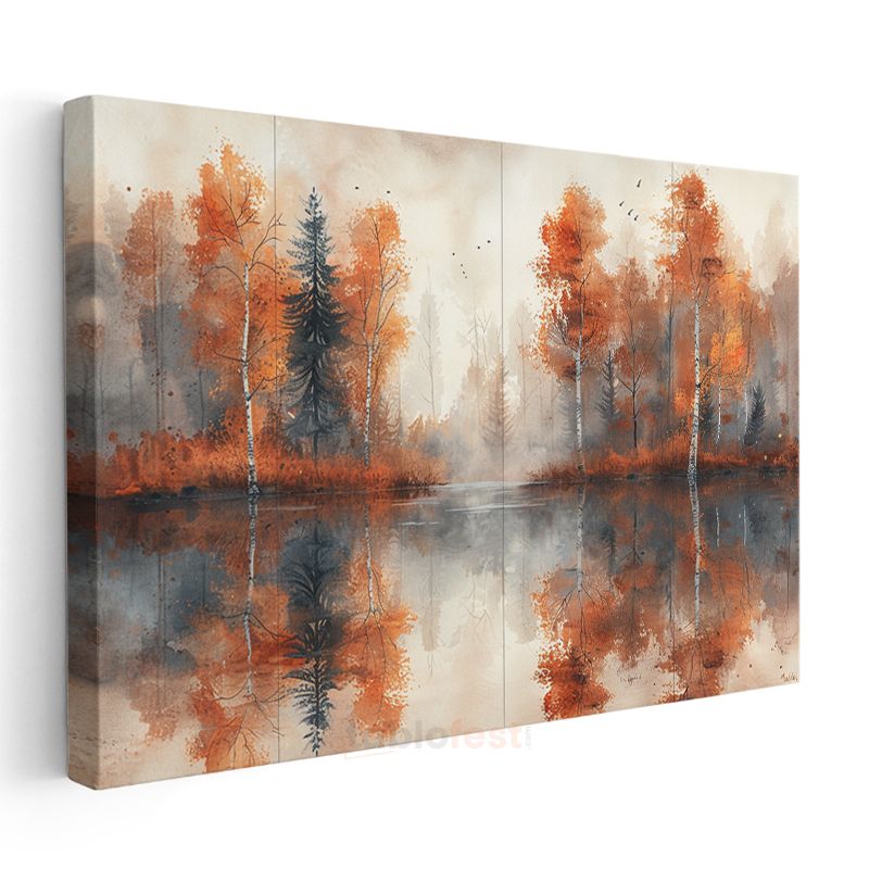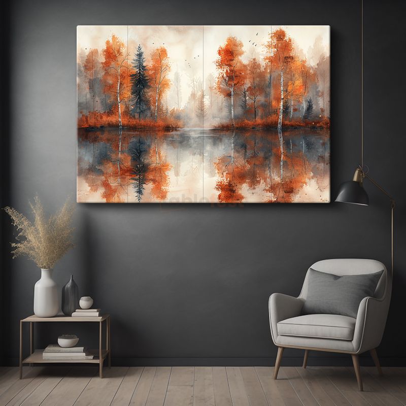 Sonbahar Ormanı - Turuncu Yaprakların Göl Yansıması Kanvas Tablo