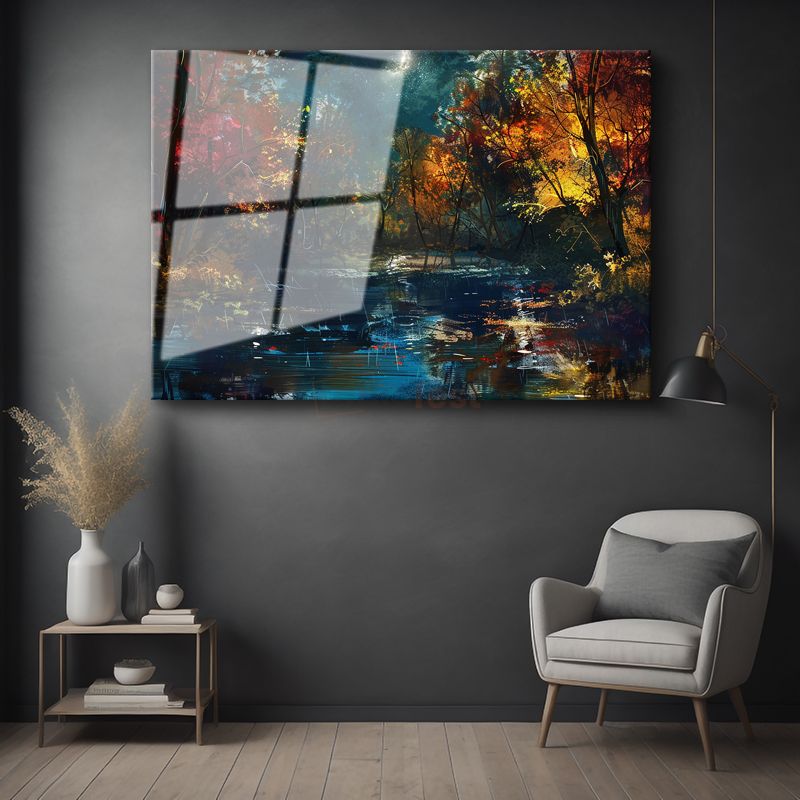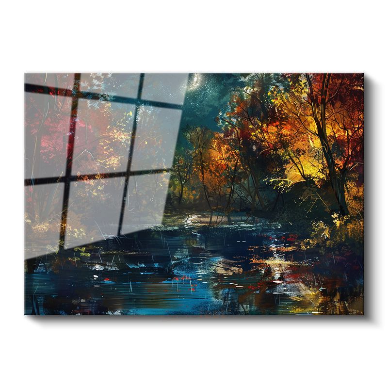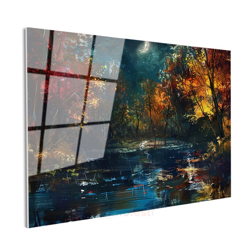 Sonbahar Ormanı - Yıldızlı Gökyüzü Altında Huzur Veren Göl Manzarası Cam Tablo