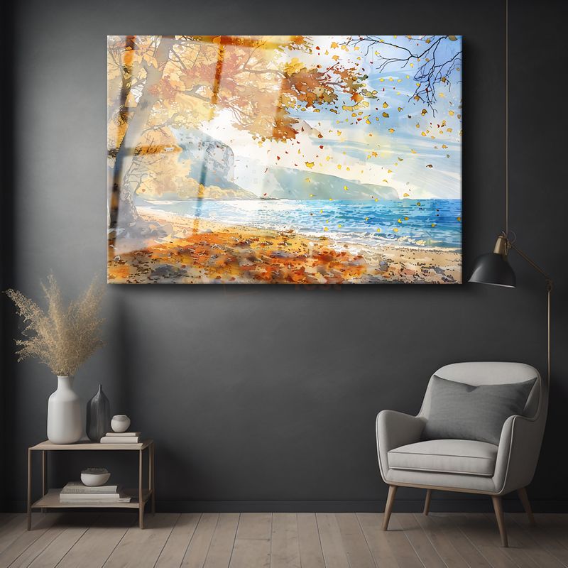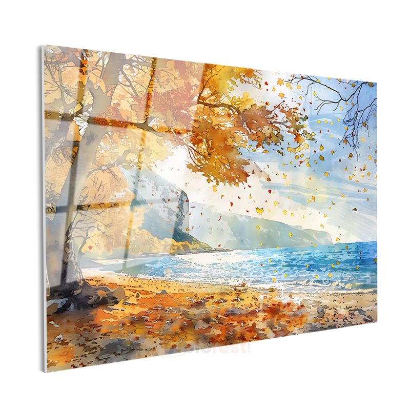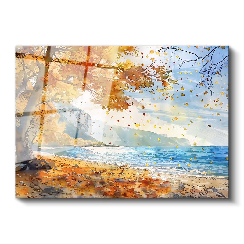 Sonbahar Sahili - Altın Yapraklı Ağaç ve Masmavi Deniz Cam Tablo