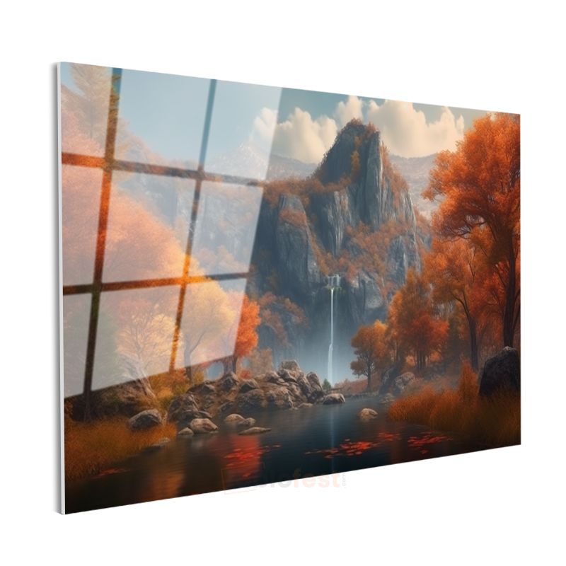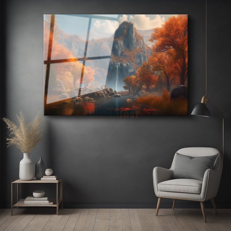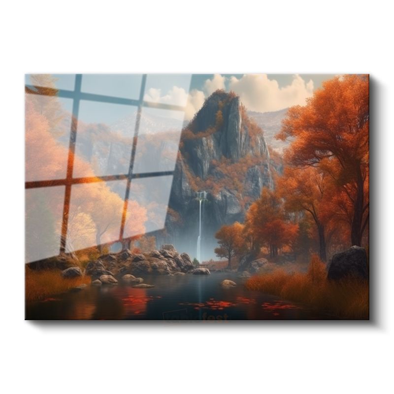 Sonbahar Şelalesi - Turuncu Yapraklı Ağaçlar ve Dağ Manzarası Cam Tablo