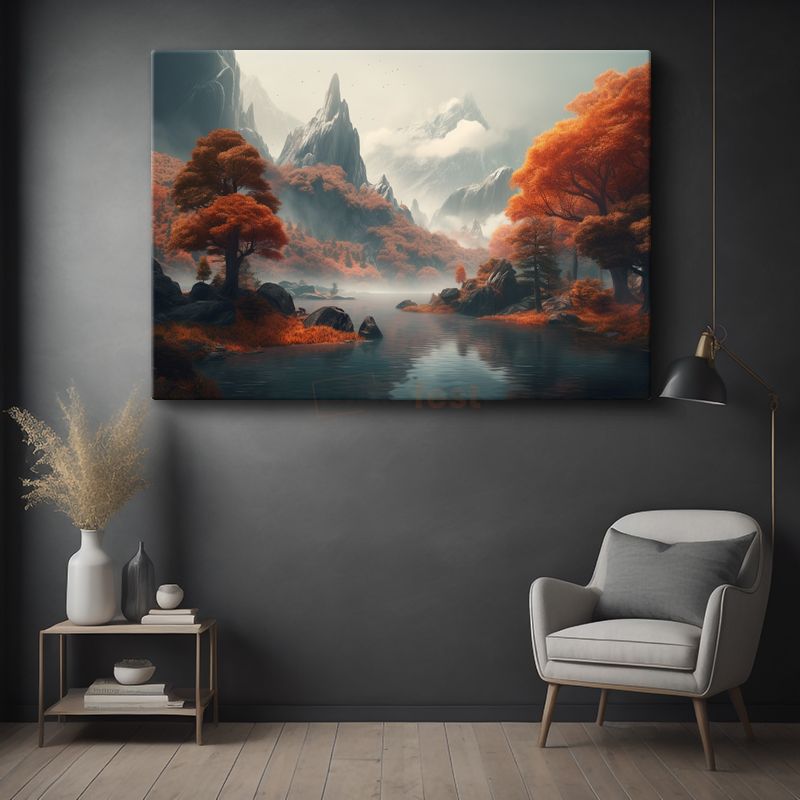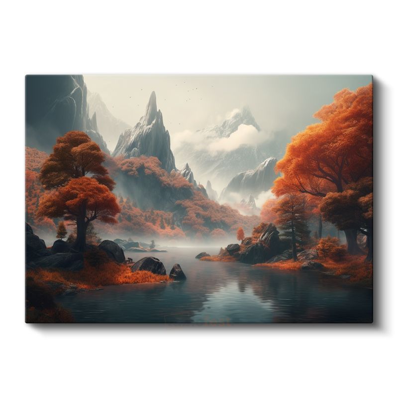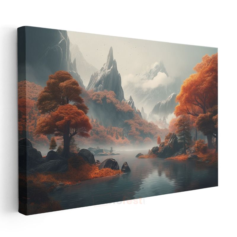 Sonbahar Vadisi - Turuncu Orman ve Sisli Dağlar Kanvas Tablo