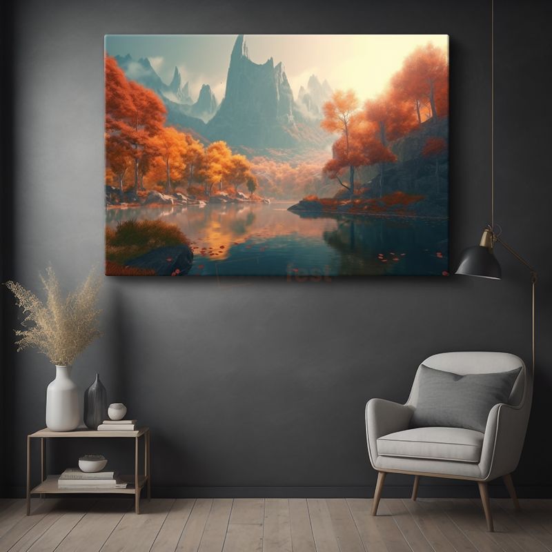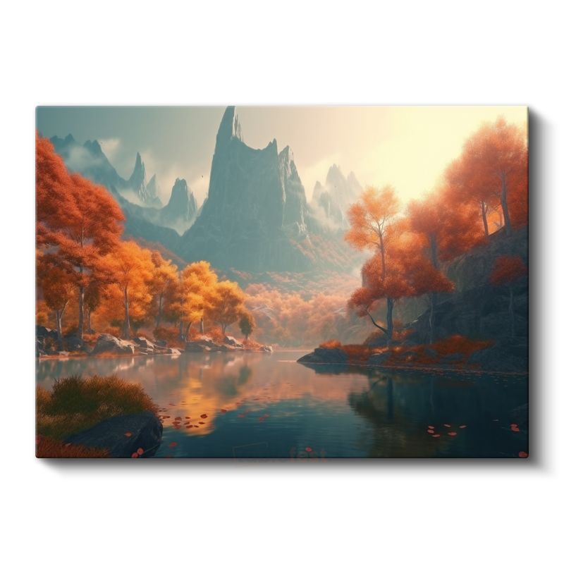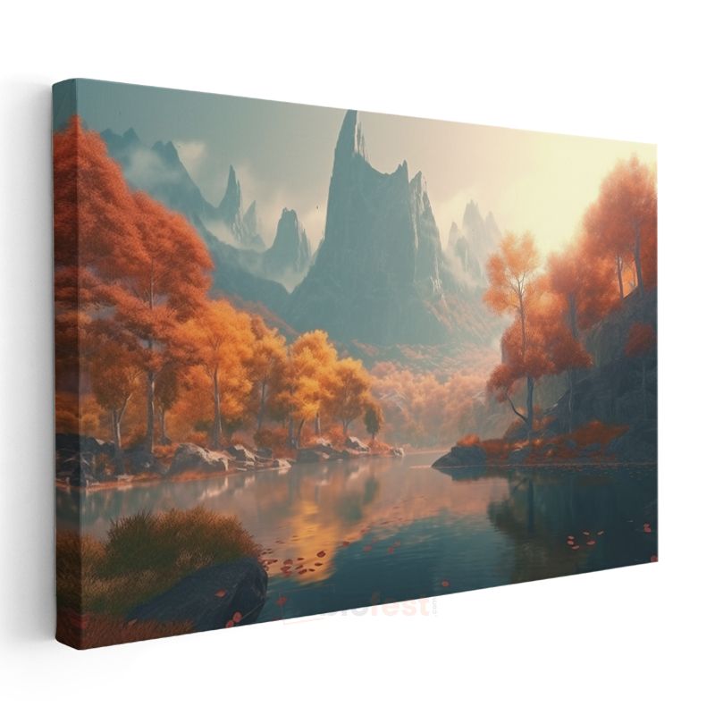 Sonbahar Vadisi - Turuncu Yaprakların Göl Yansıması Kanvas Tablo