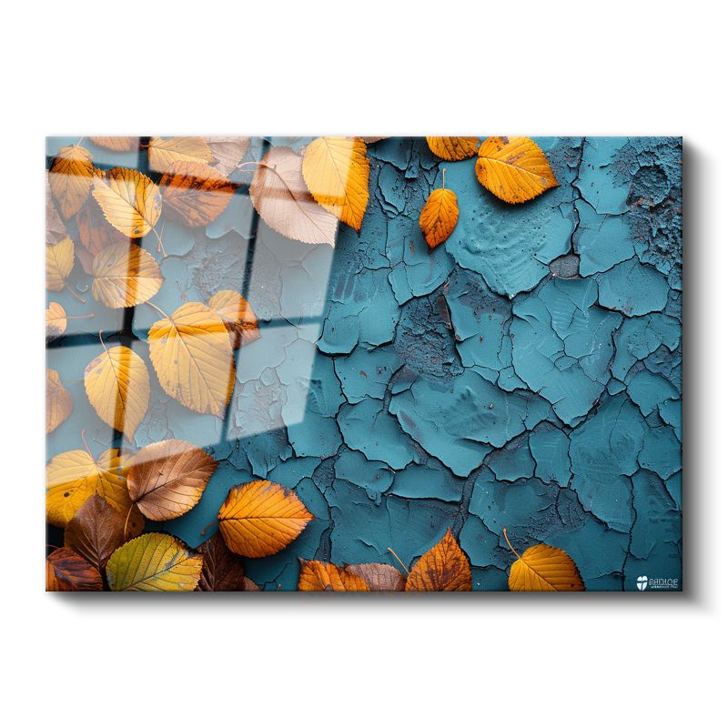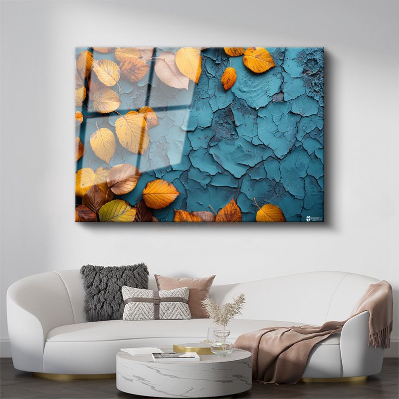 Sonbahar Yaprakları - Mavi Dokulu Zeminde Kontrast Cam Tablo