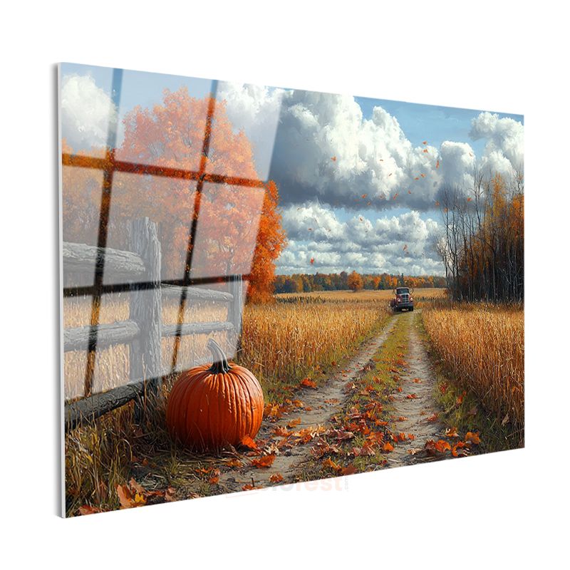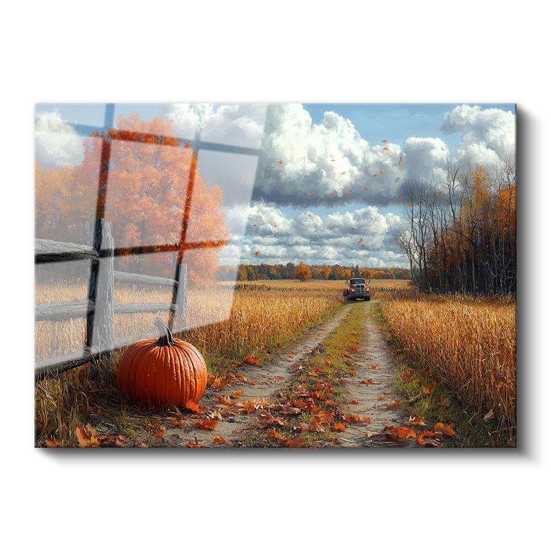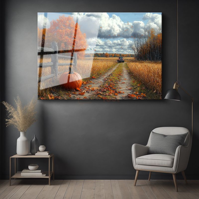 Sonbahar Yolu - Turuncu Yapraklı Ağaçlar ve Balkabağı Cam Tablo