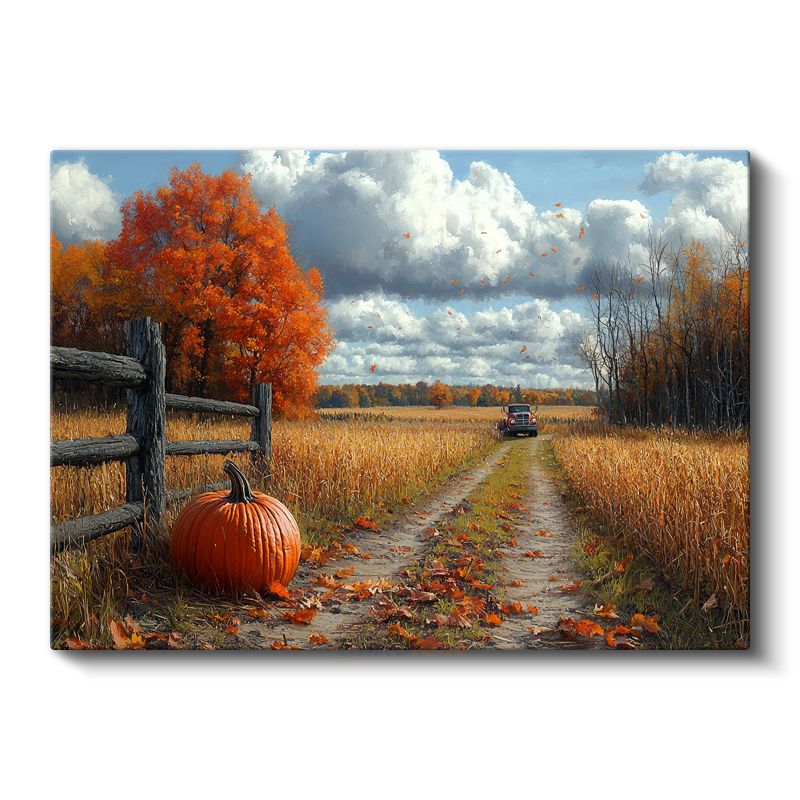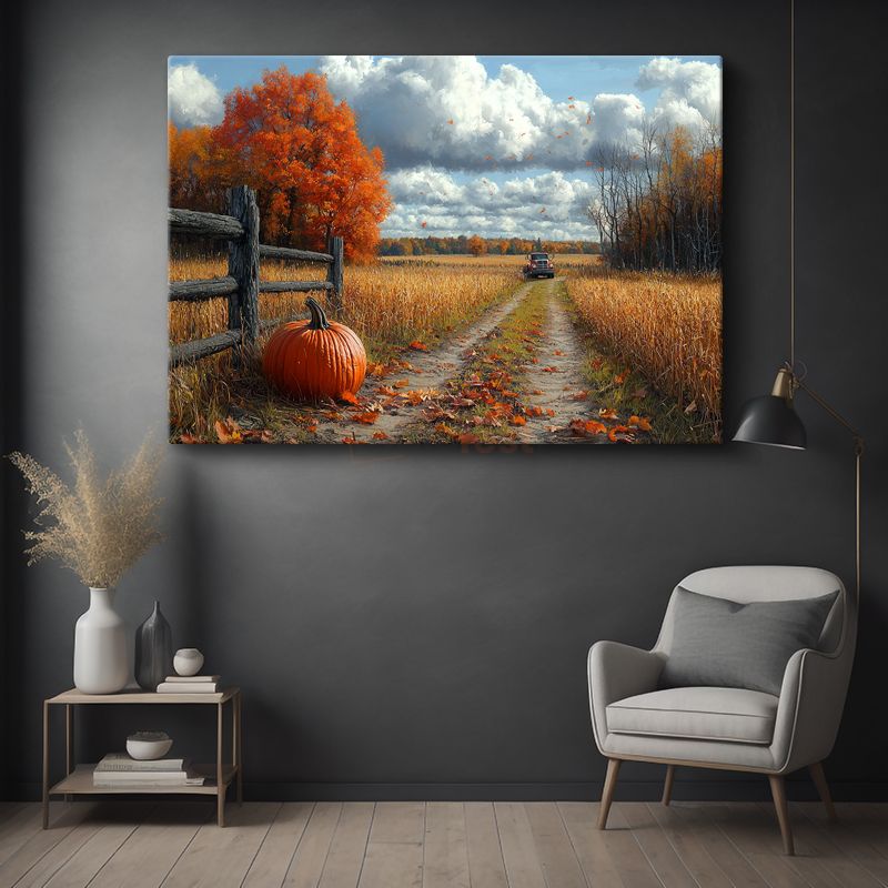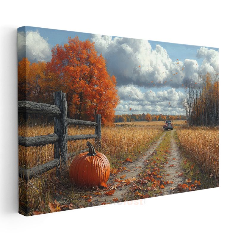 Sonbahar Yolu - Turuncu Yapraklı Ağaçlar ve Balkabağı Kanvas Tablo