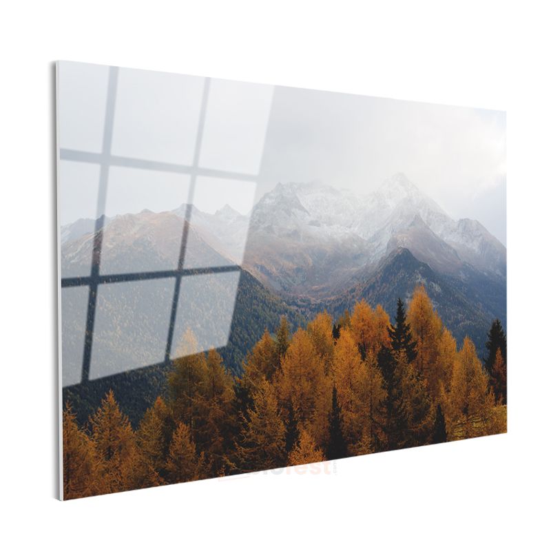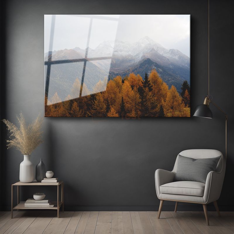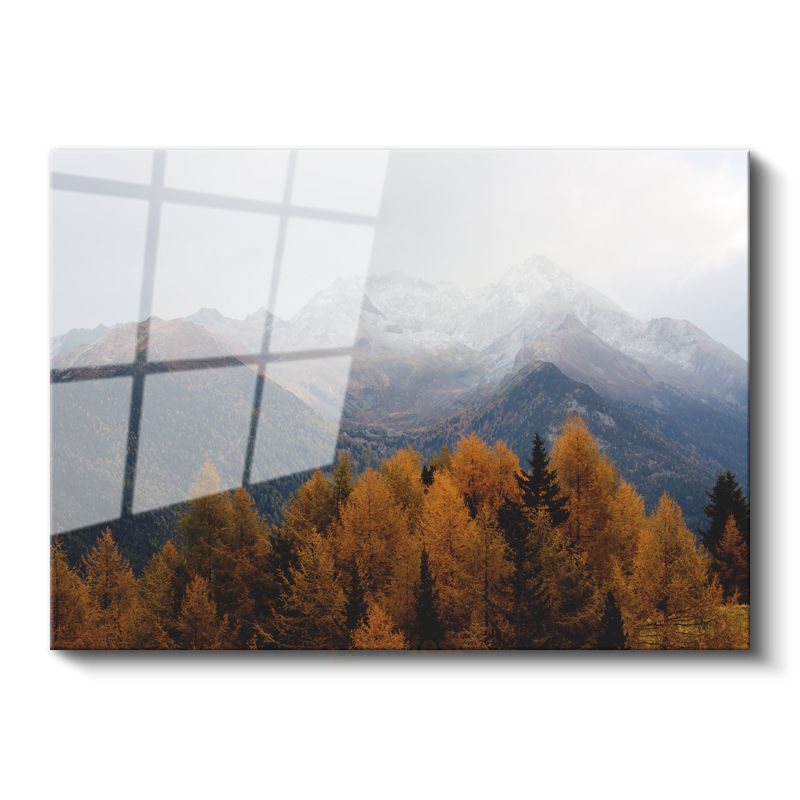 Sonbahar Zirvesi - Karlı Dağlar ve Turuncu Çamlar Cam Tablo