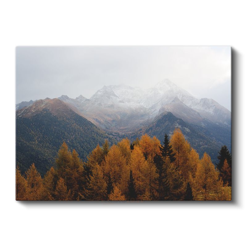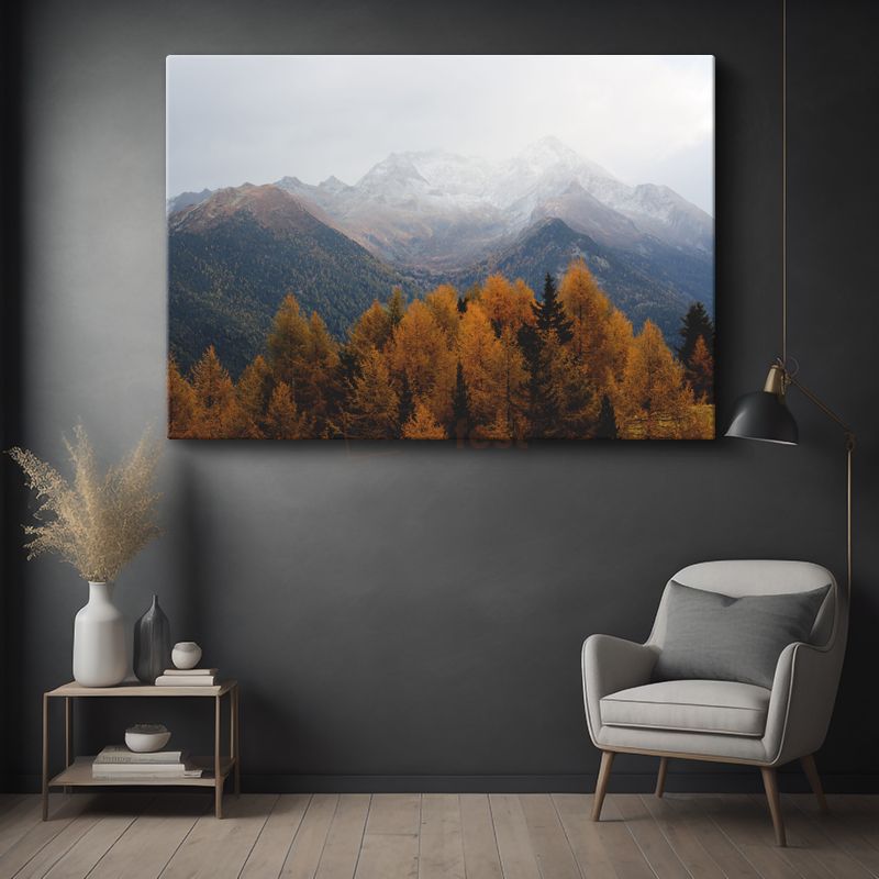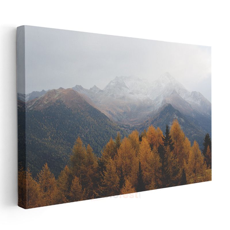 Sonbahar Zirvesi - Karlı Dağlar ve Turuncu Çamlar Kanvas Tablo