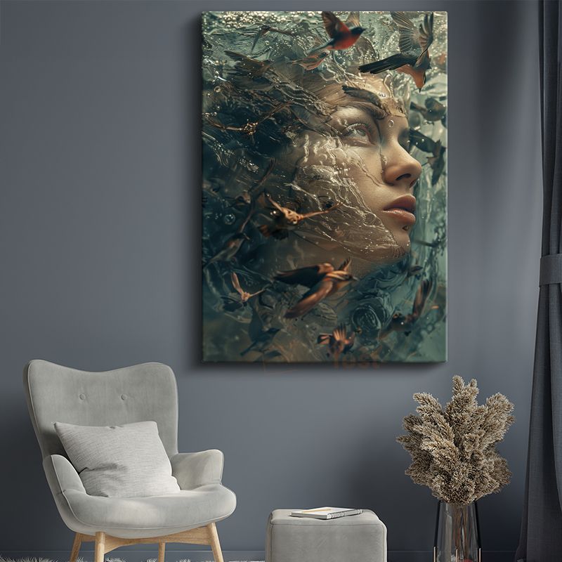 Su Altı Düşleri - İnsan Yüzü Ve Kuşların Uyumlu Dansı Kanvas Tablo