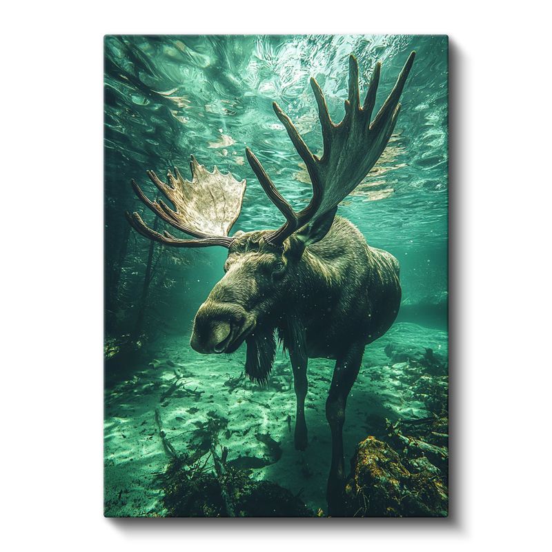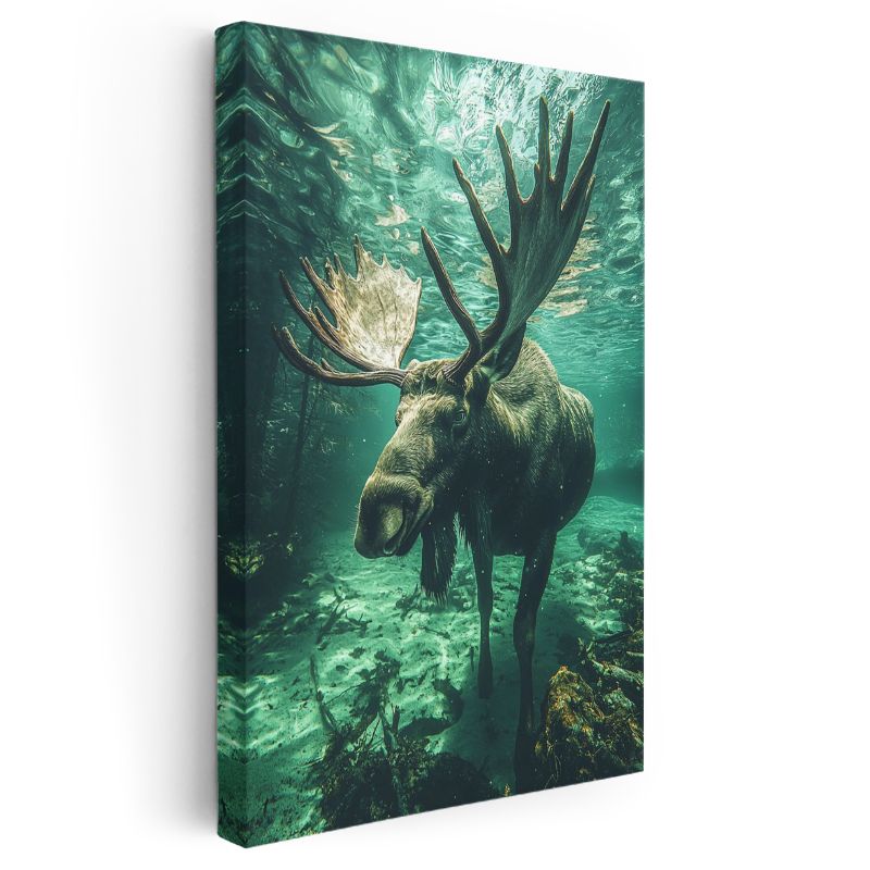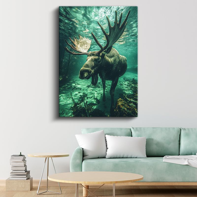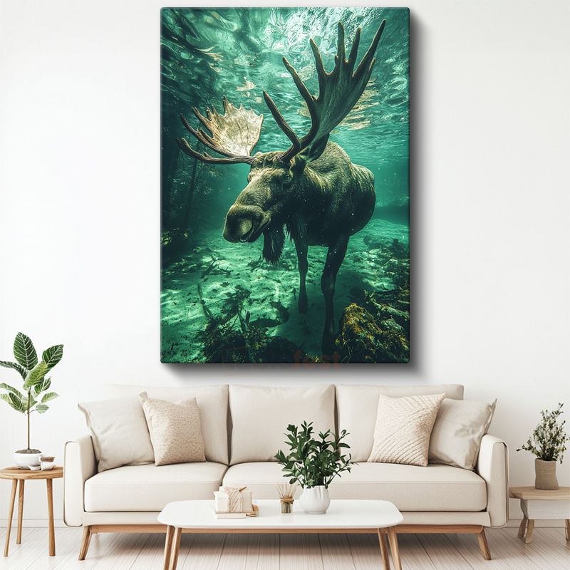 Su Altı Geyiği - Yeşil Derinliklerde Yüzen Boynuzlu Devasa Kanvas Tablo