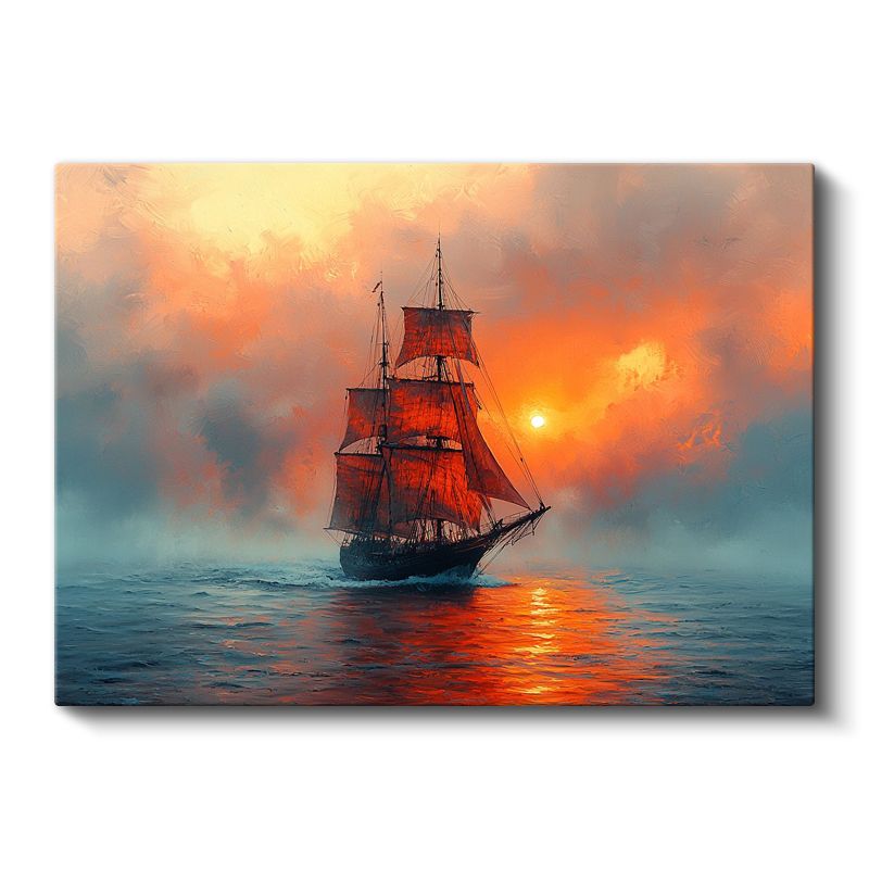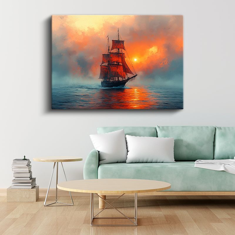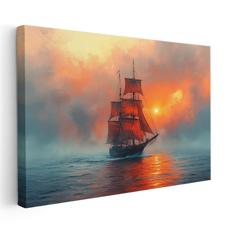 Tarihi Yelkenli - Turuncu Gün Batımında Kanvas Tablo