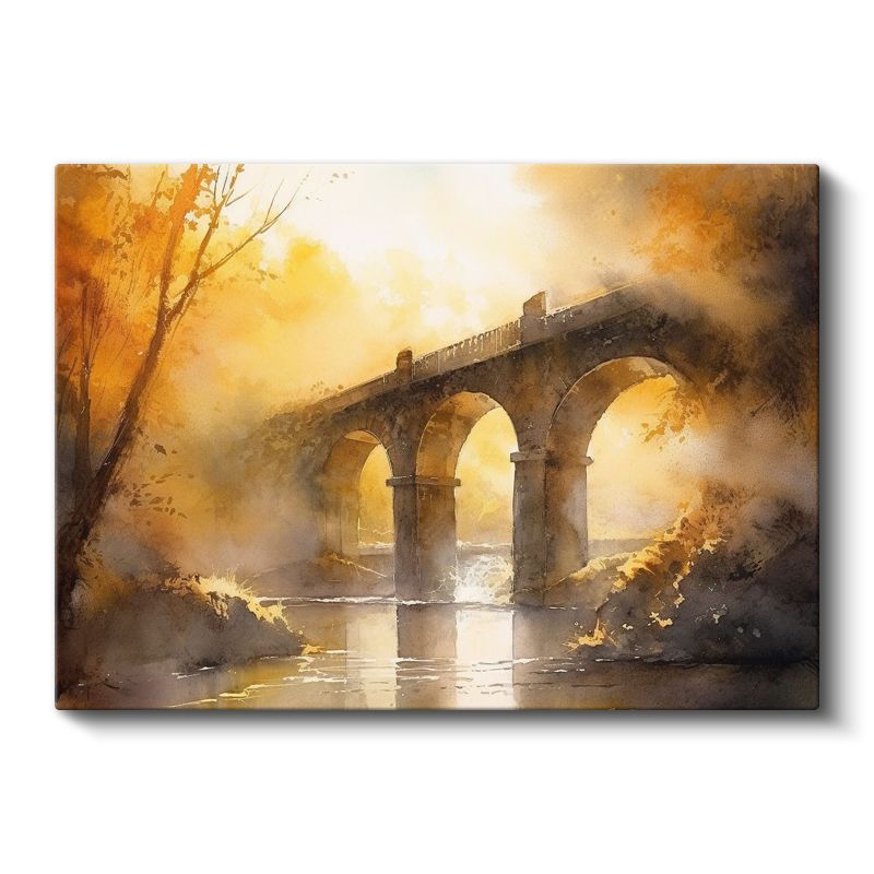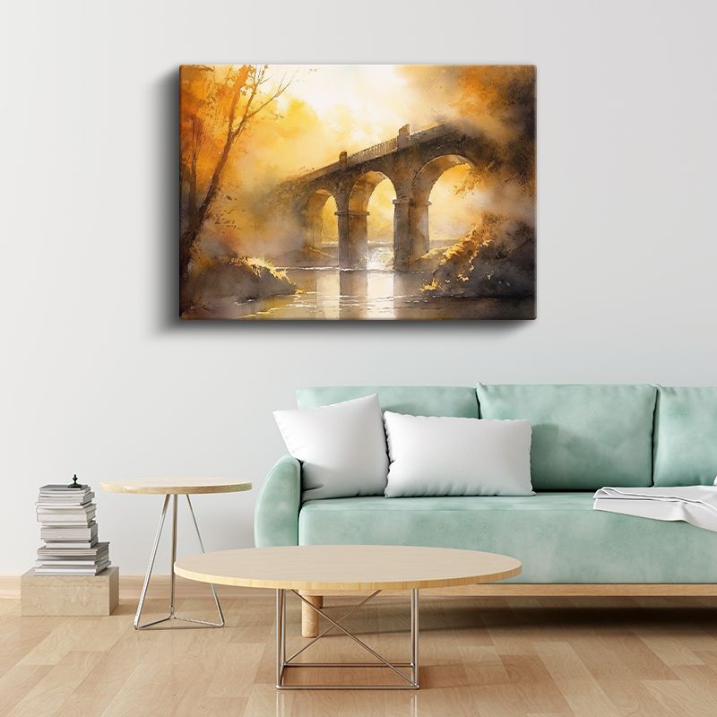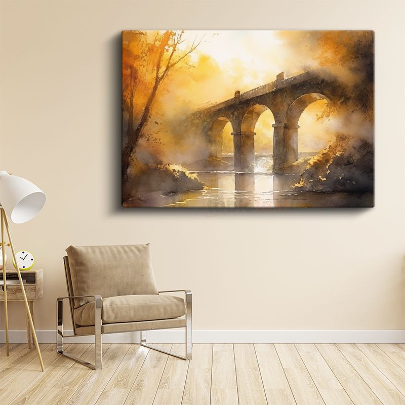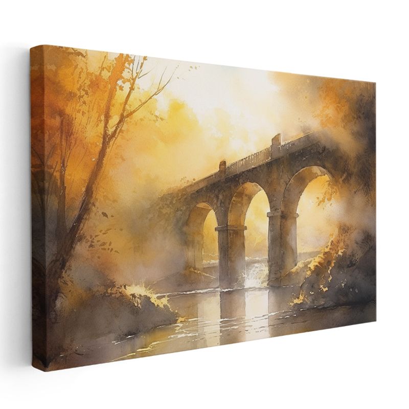 Taş Köprü - Altın Sarısı Işıkta Nehir Manzarası Kanvas Tablo