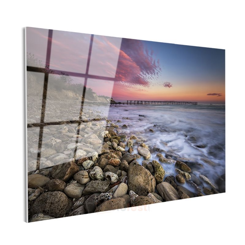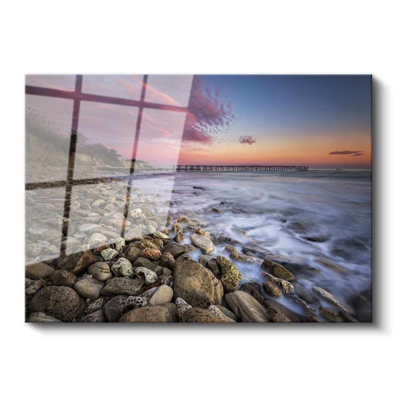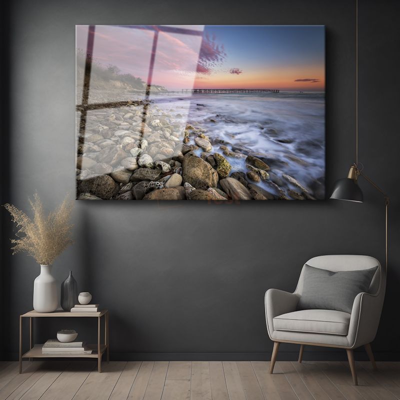 Taşlı Sahil - Gün Batımında Büyüleyici Kıyı Manzarası Cam Tablo