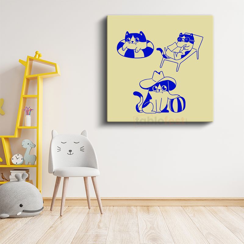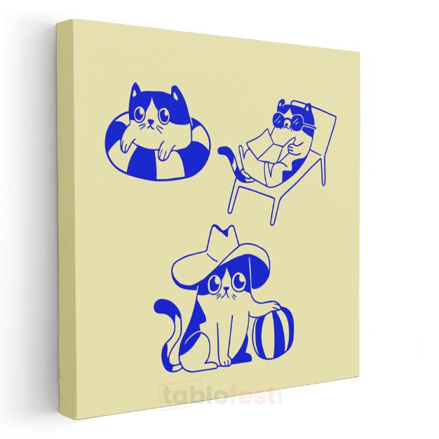 Tatil Kedileri - Mavi Çizgili Sevimli Dostlar Kanvas Tablo