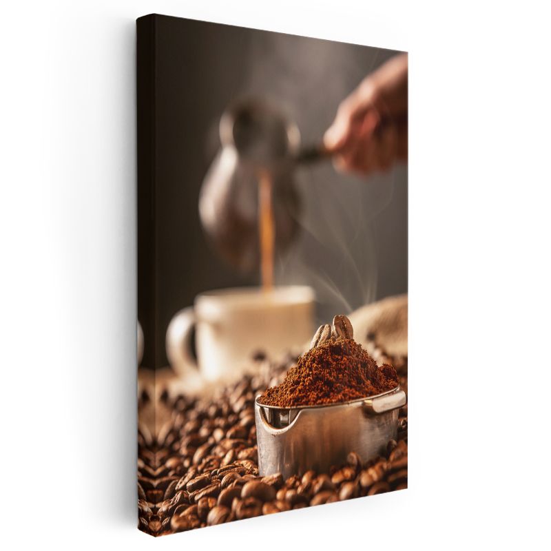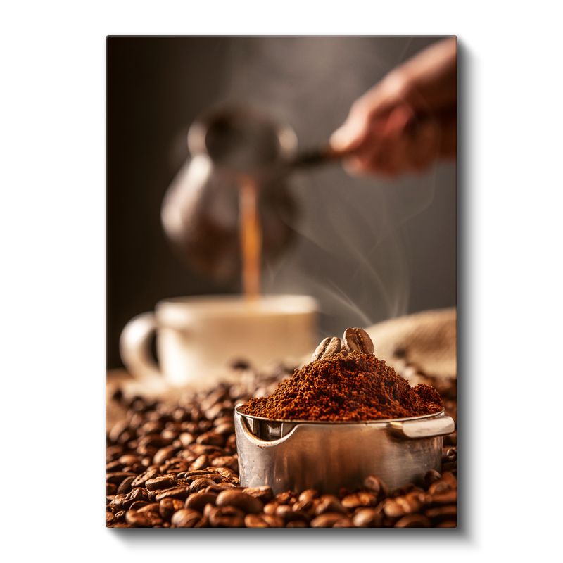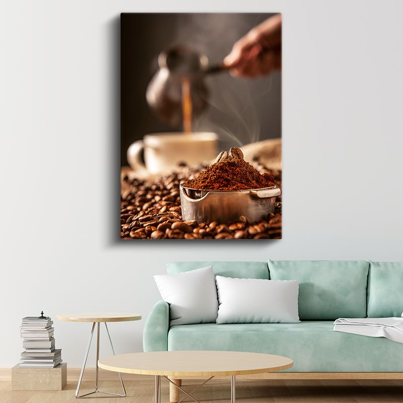 Taze Kahve - Öğütülmüş Kahve Çekirdekleri ve Buharı Tüten Fincan Kanvas Tablo