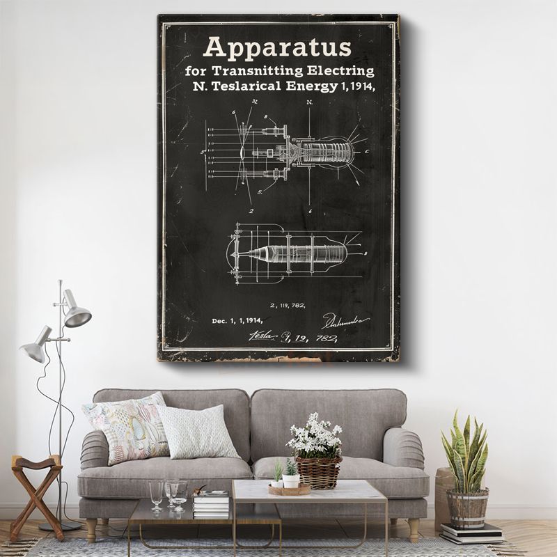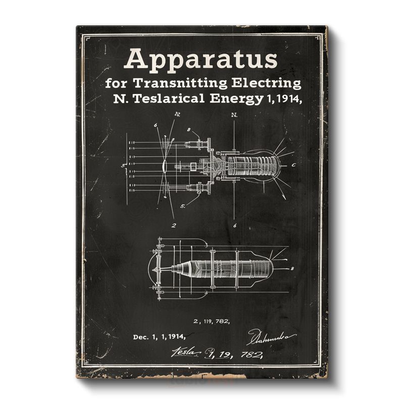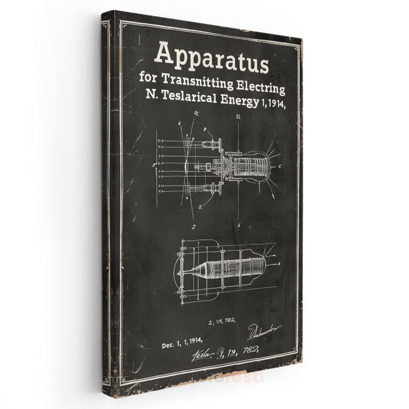 Tesla Cihazı - Elektrik İletim Aparatı Patent Çizimi Kanvas Tablo