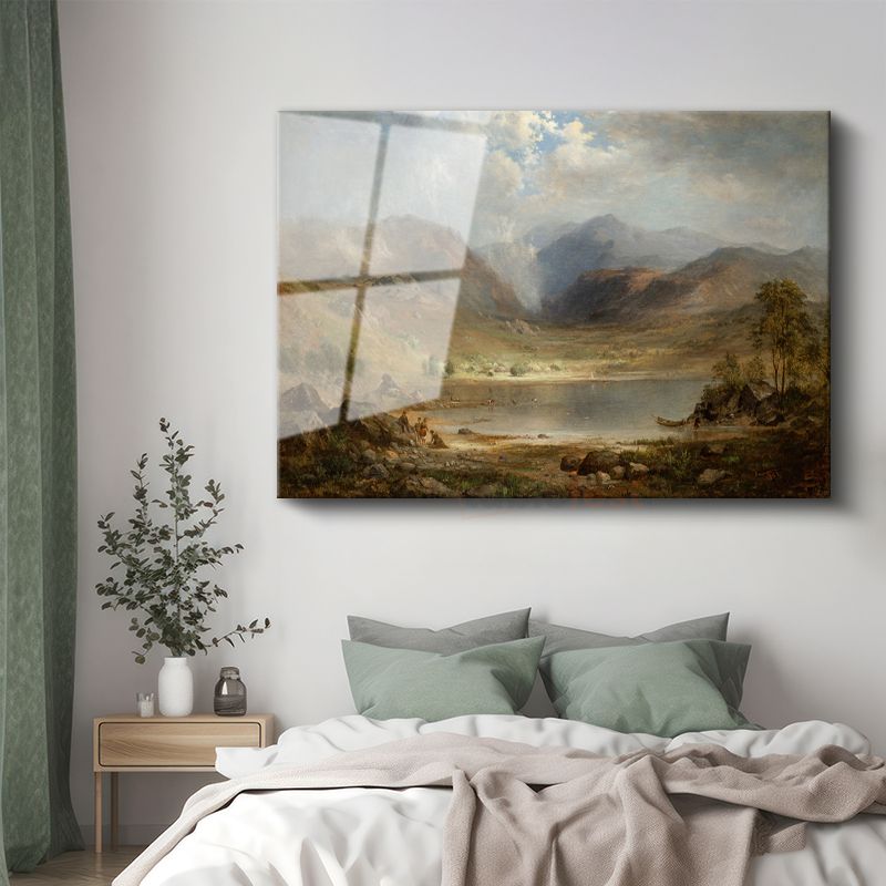 Thomas Moran - Dağlık Vadide Göl Manzarası Cam Tablo