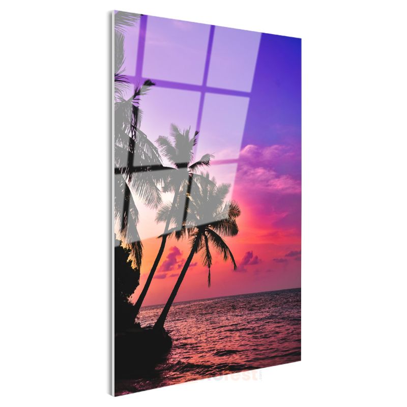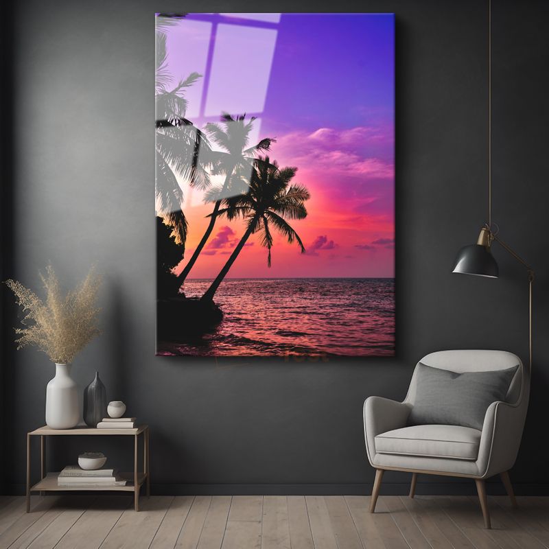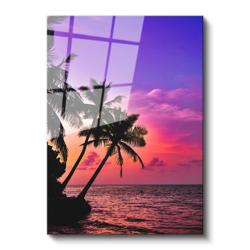 Tropik Günbatımı - Palmiyeler ve Mor Ufuklar Cam Tablo