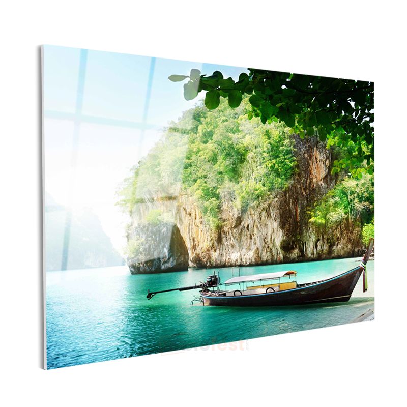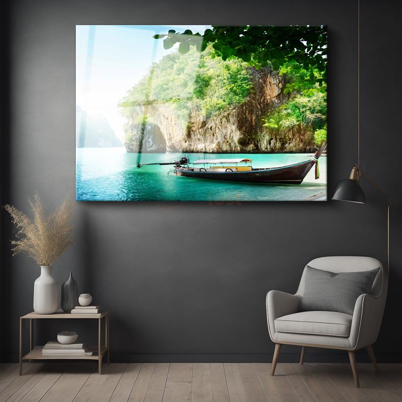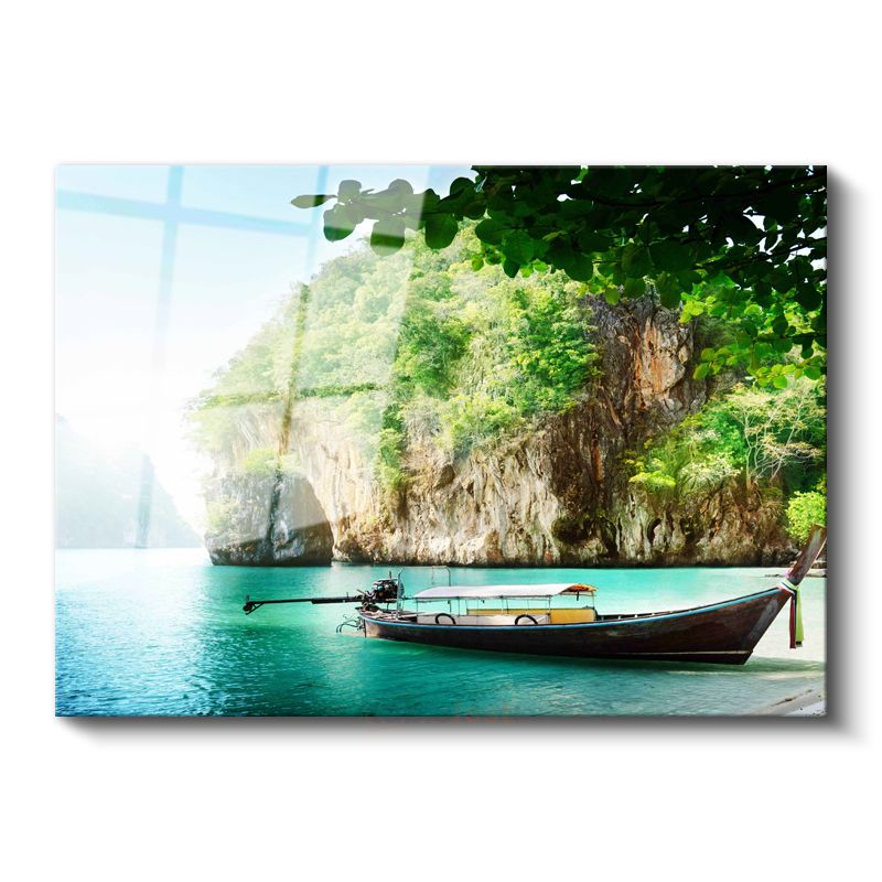 Tropik Koy - Zümrüt Yeşili Sular ve Kayalıklar Cam Tablo