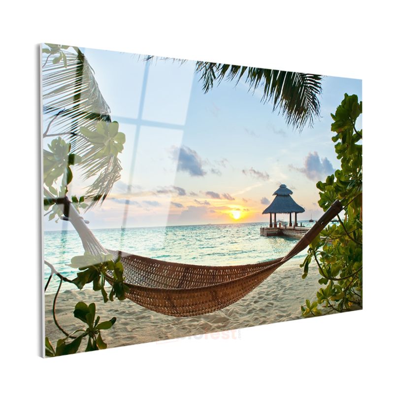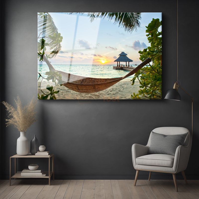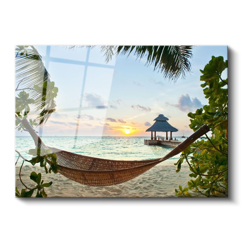 Tropikal Cennet - Hamak ve Gün Batımında Sahil Cam Tablo