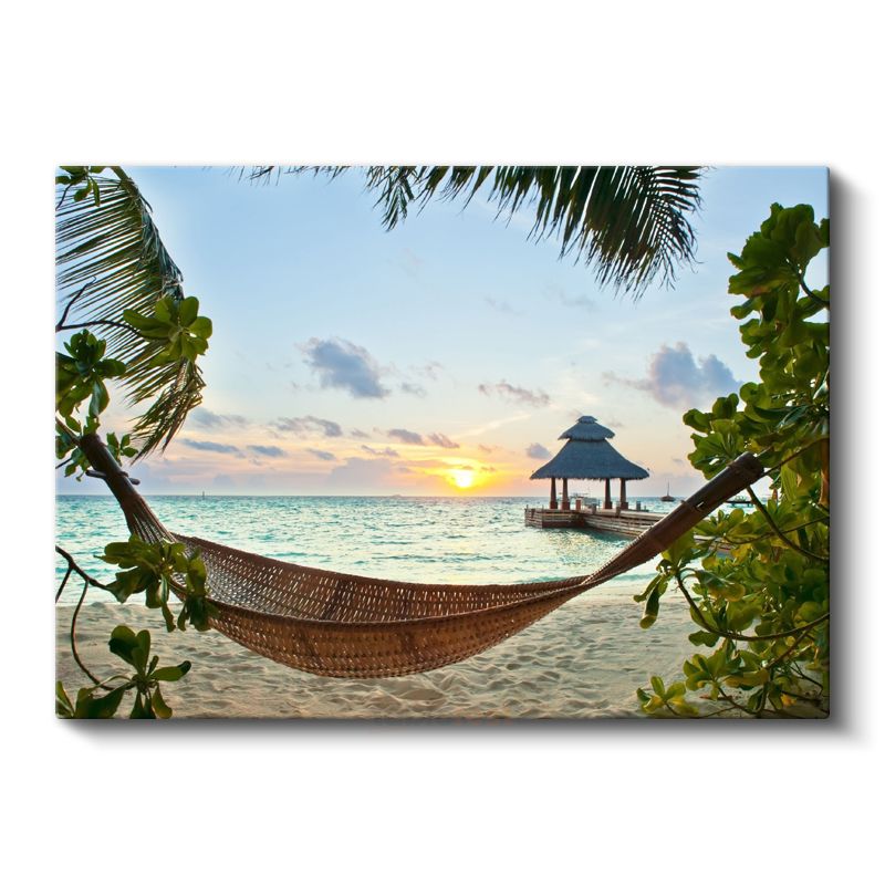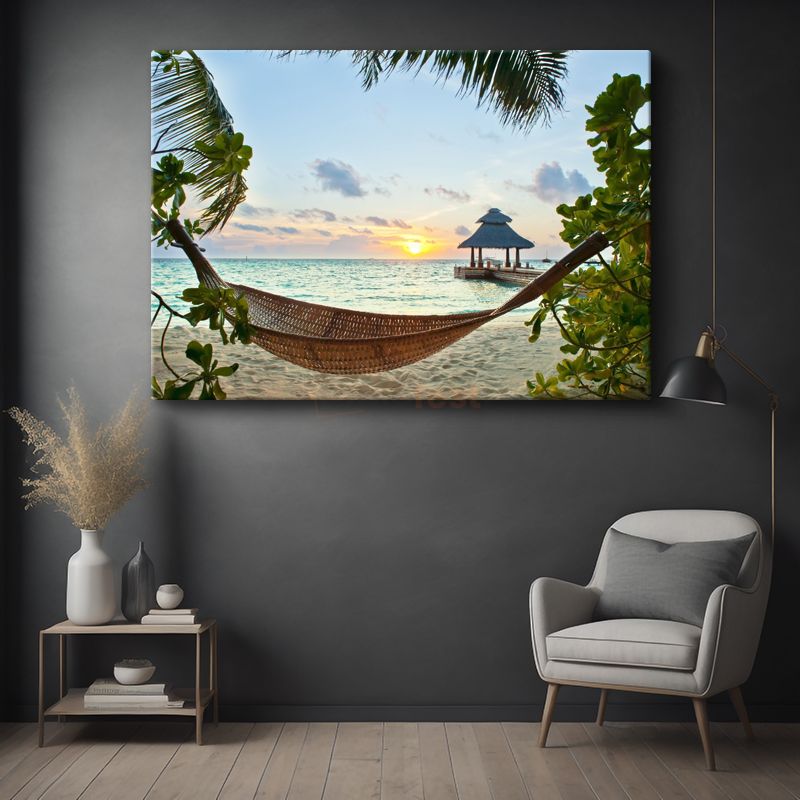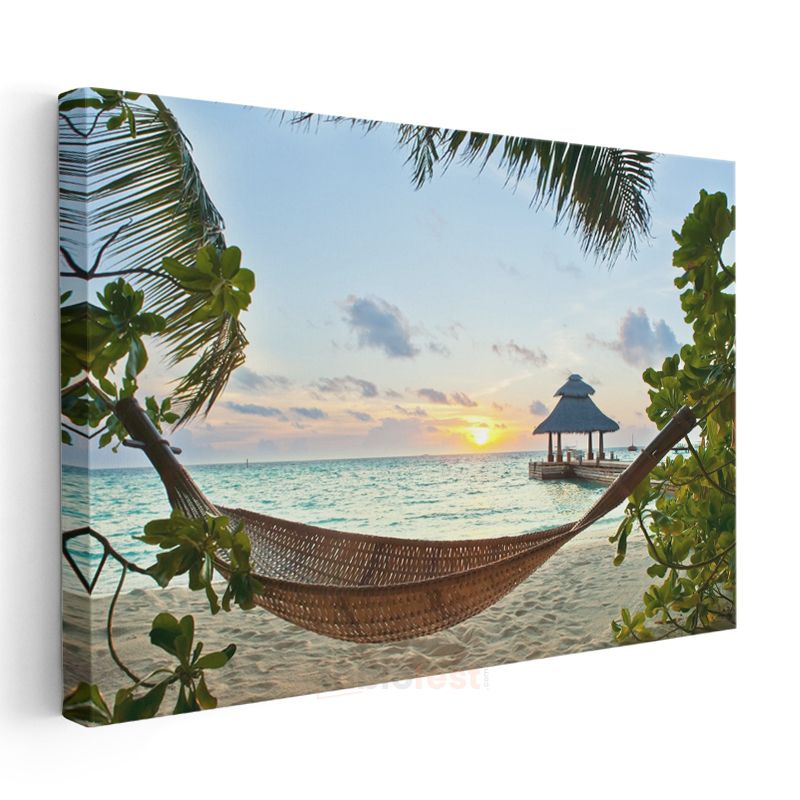 Tropikal Cennet - Hamak ve Gün Batımında Sahil Kanvas Tablo