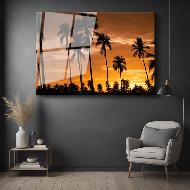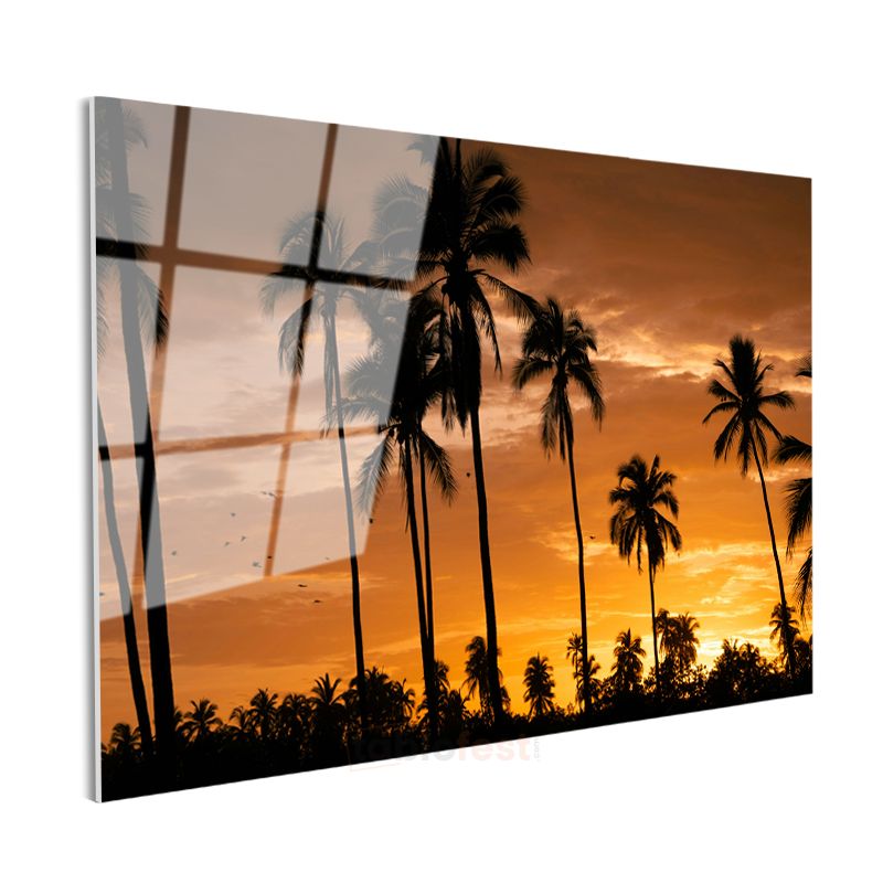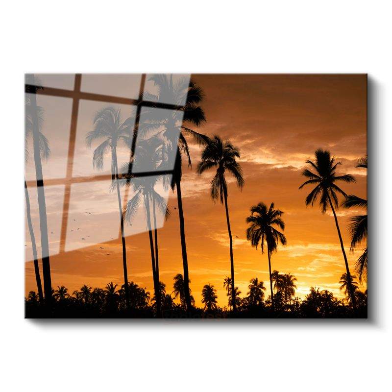 Tropikal Günbatımı - Palmiye Siluetleri ve Altın Gökyüzü Cam Tablo