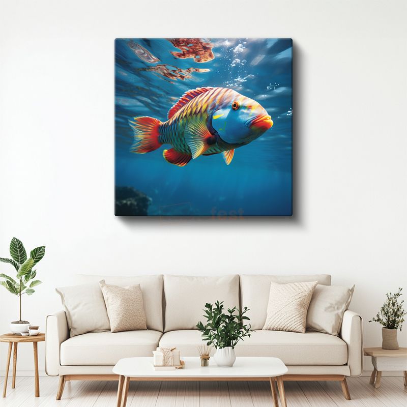 Tropikal Papağan Balığı - Mavi Derinliklerin Renkli Yüzücüsü Kanvas Tablo