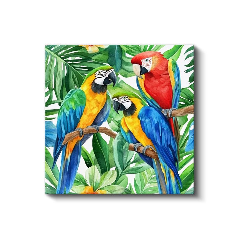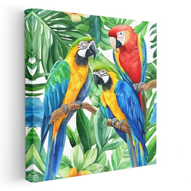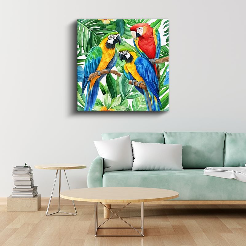 Tropikal Papağanlar - Yapraklar Arasında Renkli Üçlü Kanvas Tablo