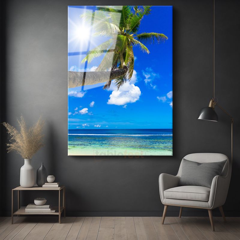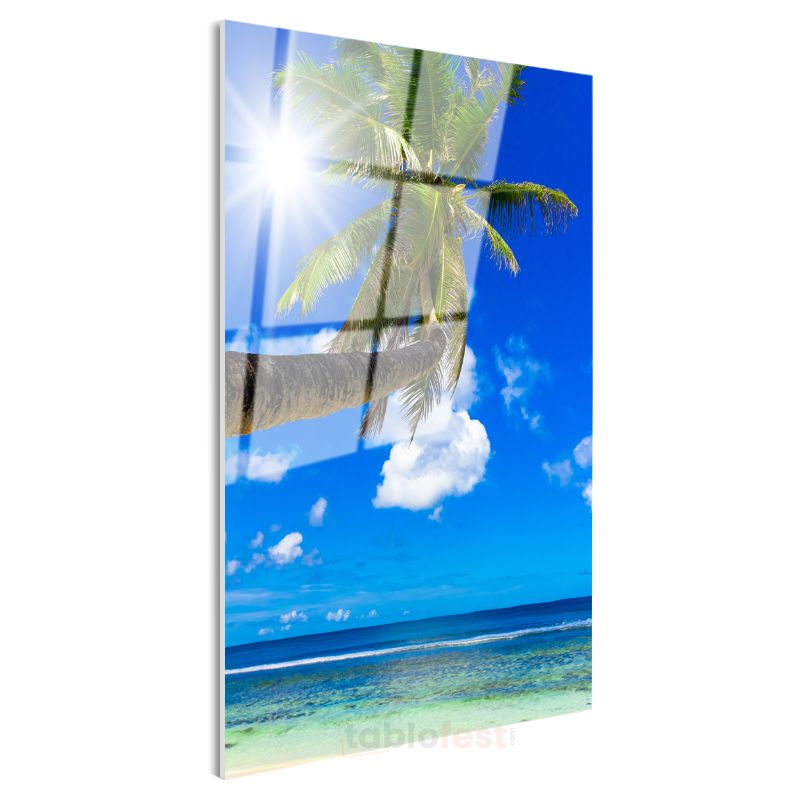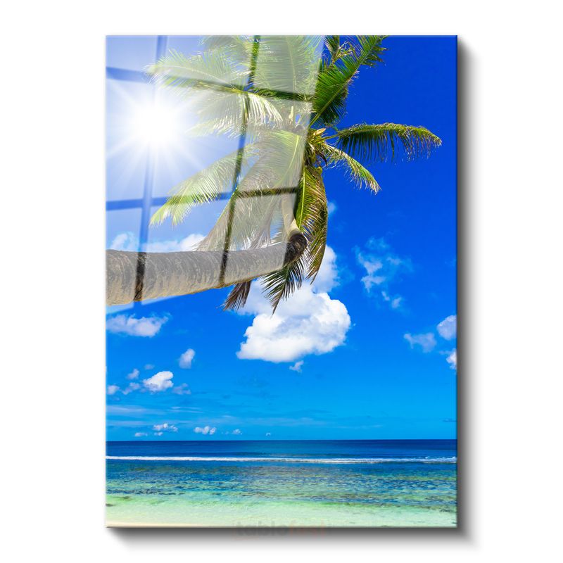 Turkuaz Cennet - Eğik Palmiye ve Kristal Deniz Cam Tablo