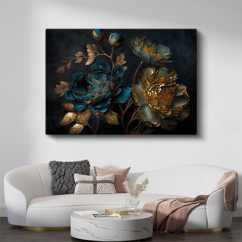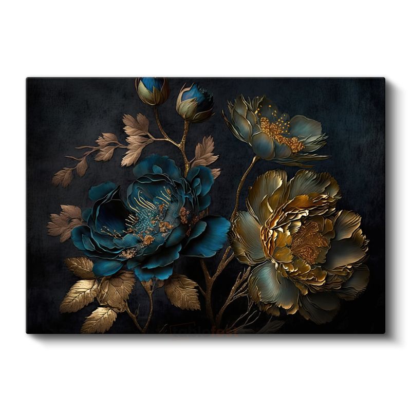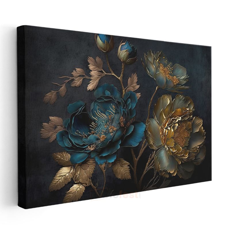 Turkuaz Çiçekler - Altın Detaylı Bahar Dalları Kanvas Tablo