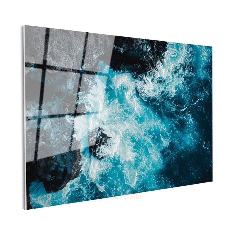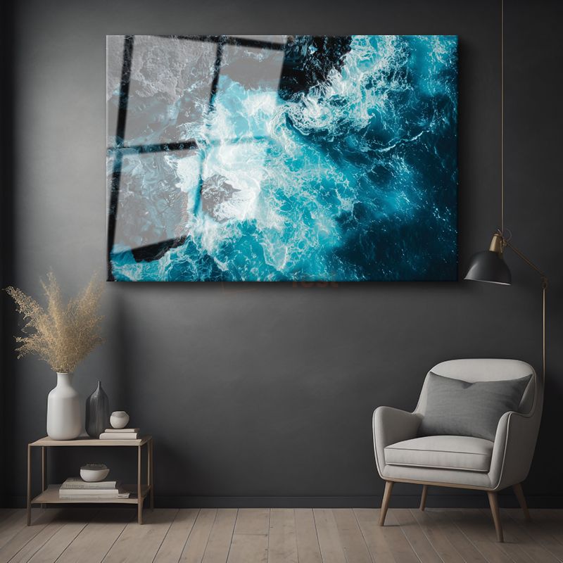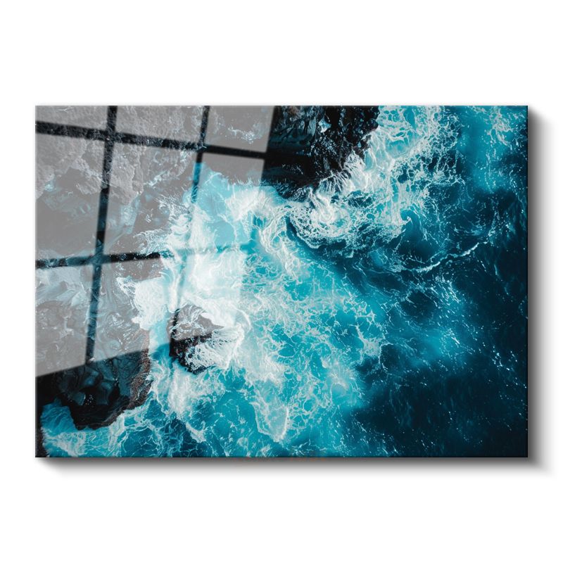 Turkuaz Dalgalar - Kayalıklarda Dans Eden Deniz Cam Tablo