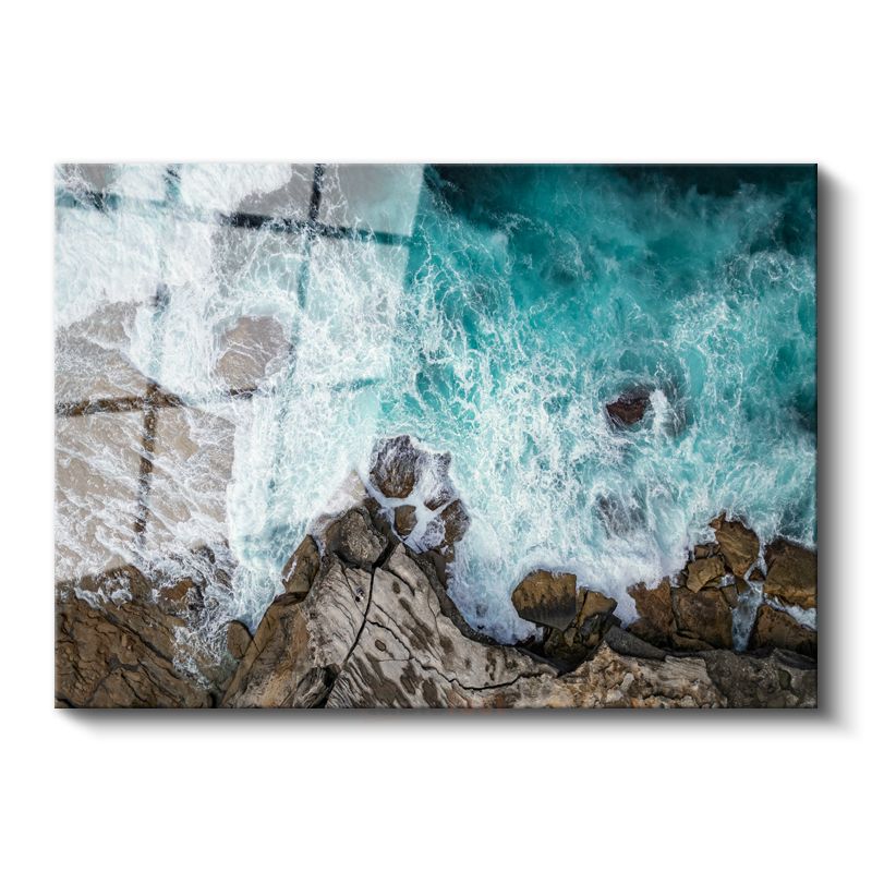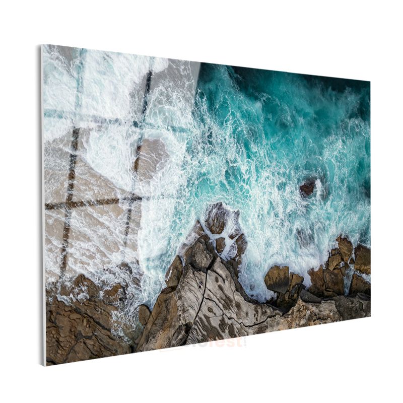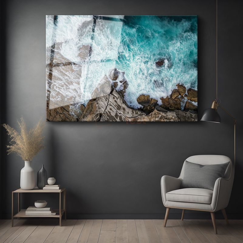Turkuaz Deniz - Kayalık Kıyıda Dans Eden Dalgaların Huzuru Cam Tablo