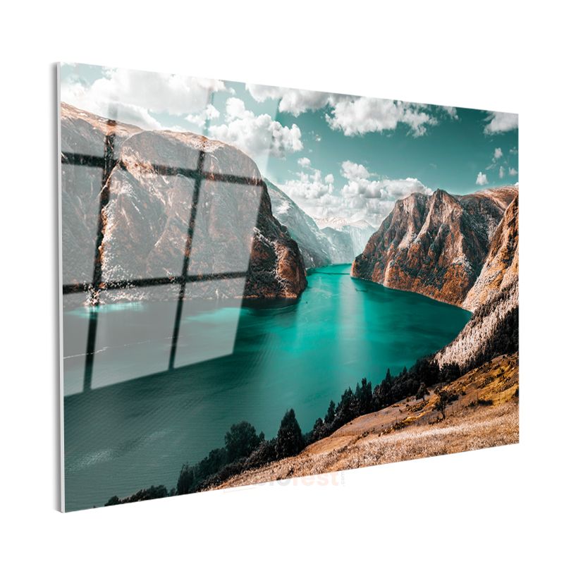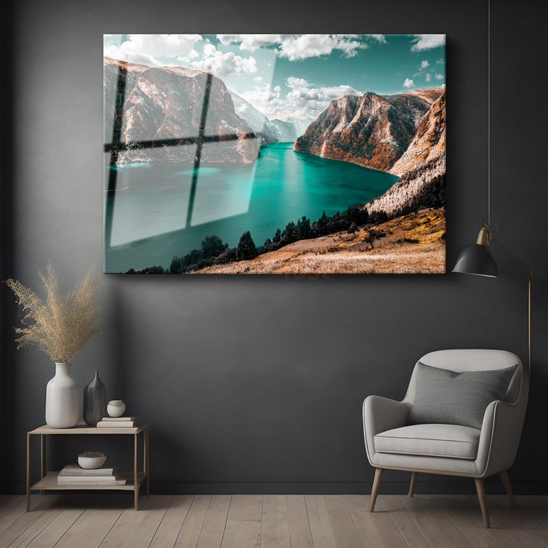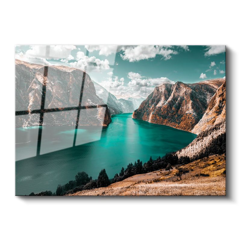 Turkuaz Fiyort - Dağlar Arasında Huzur Veren Su Manzarası Cam Tablo