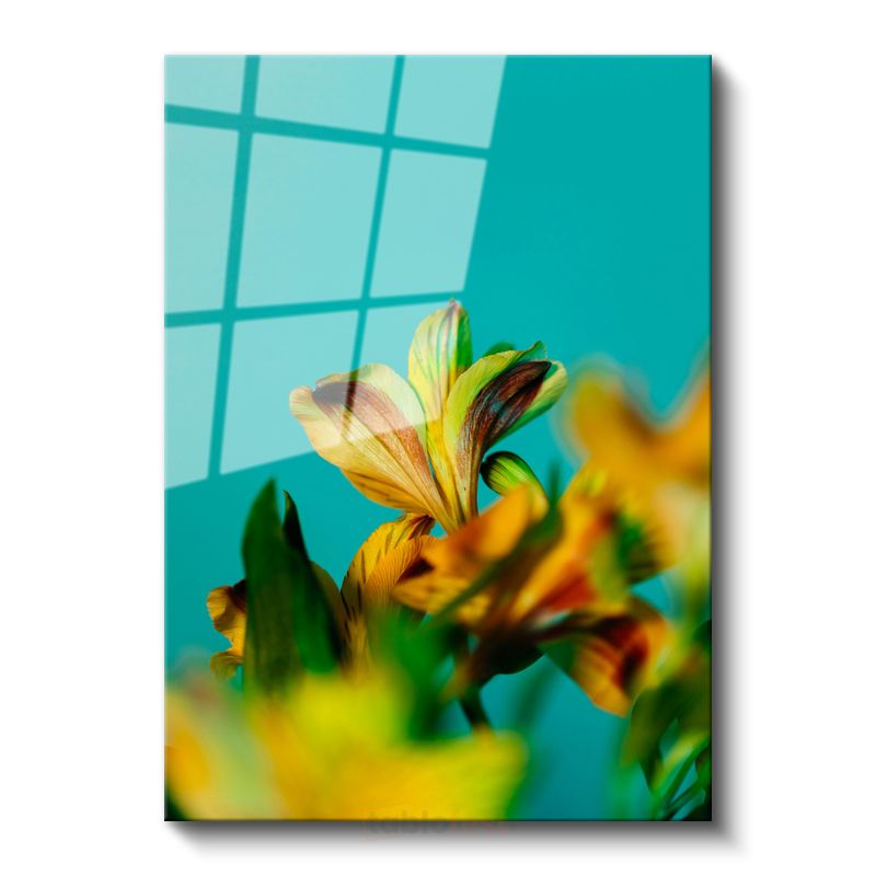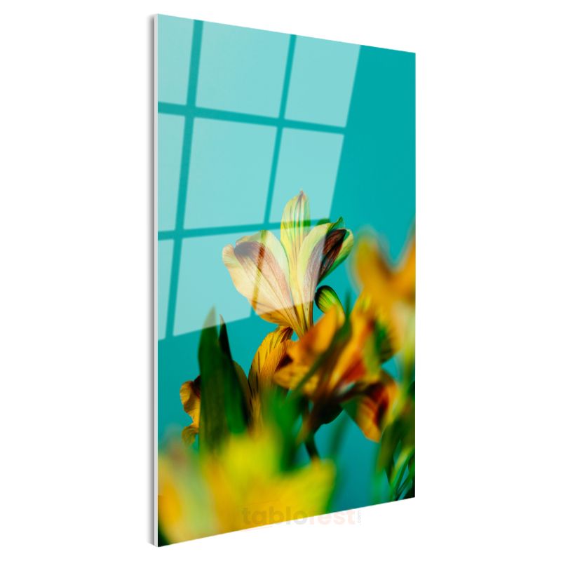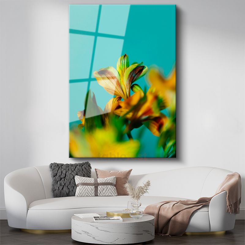 Turkuaz Gökyüzü Zambakları - Canlı Sarı Çiçek Cam Tablo
