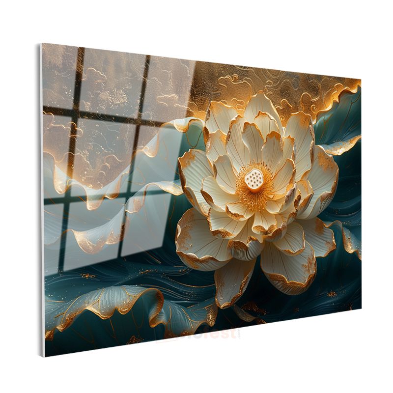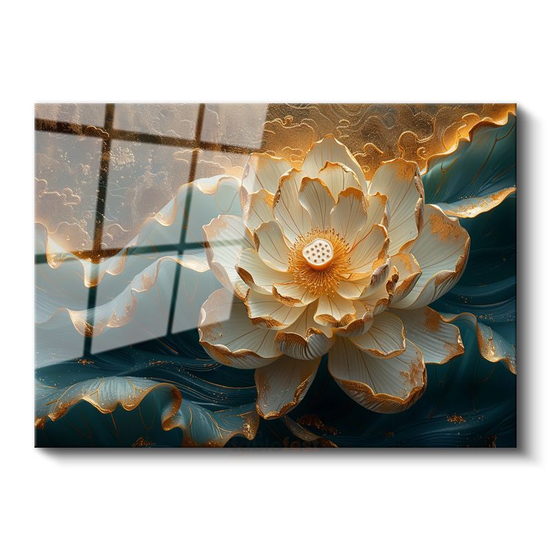 Turkuaz Nilüfer - Altın Detaylı Lüks Çiçek Sanatı Cam Tablo
