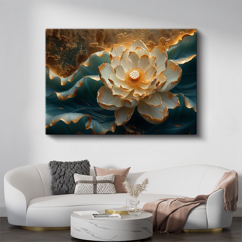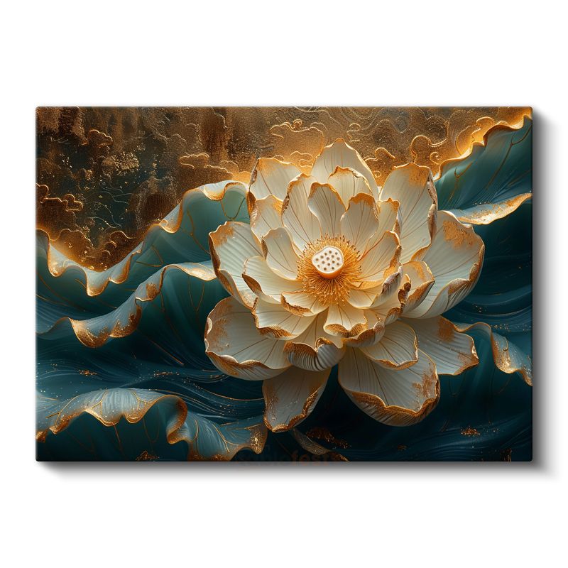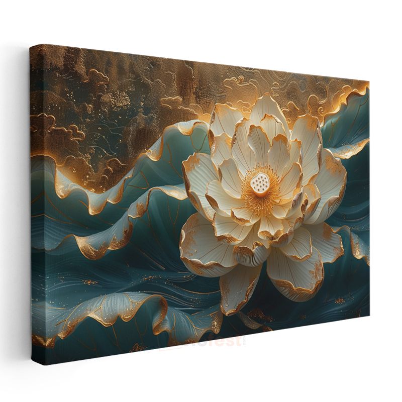 Turkuaz Nilüfer - Altın Detaylı Lüks Çiçek Sanatı Kanvas Tablo