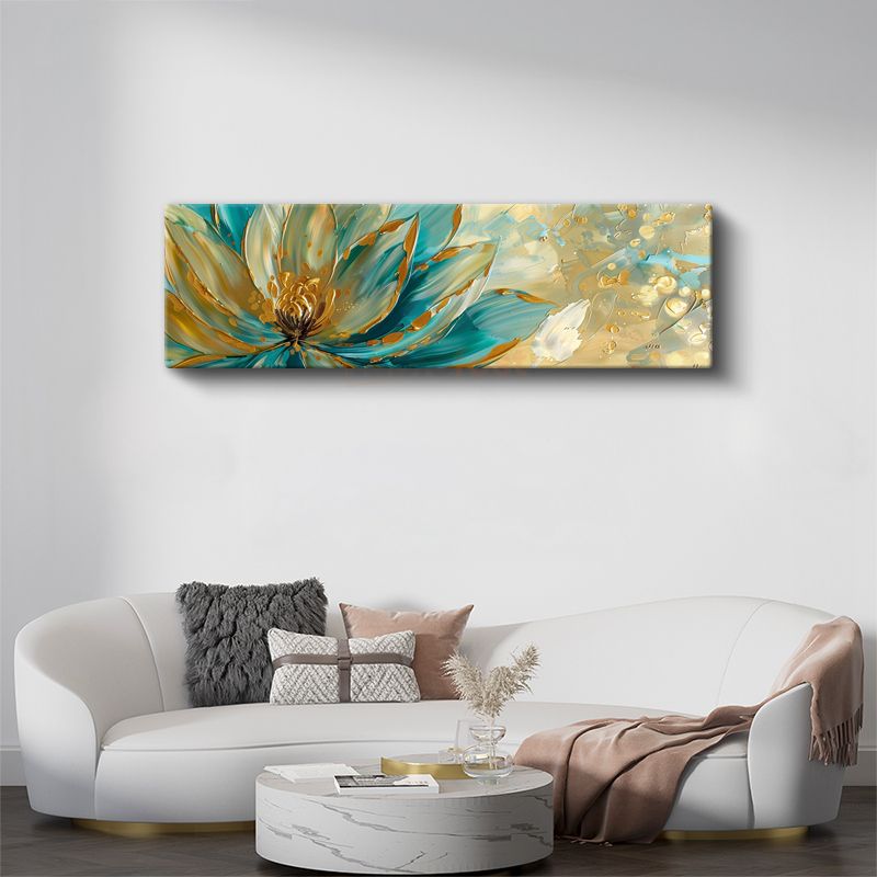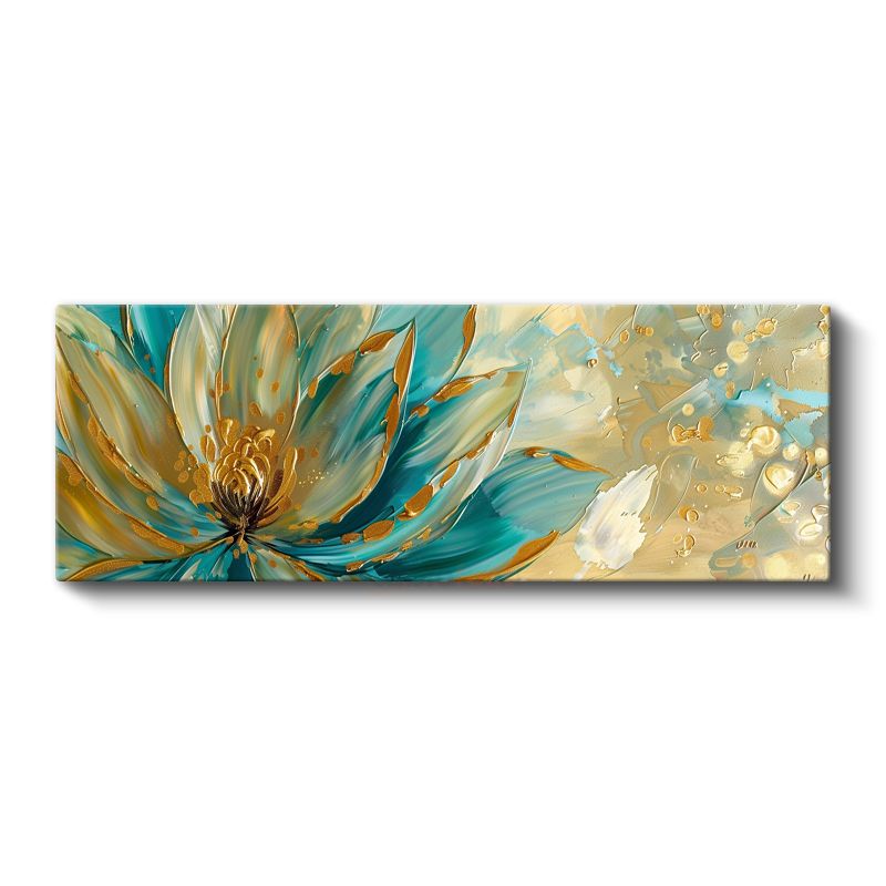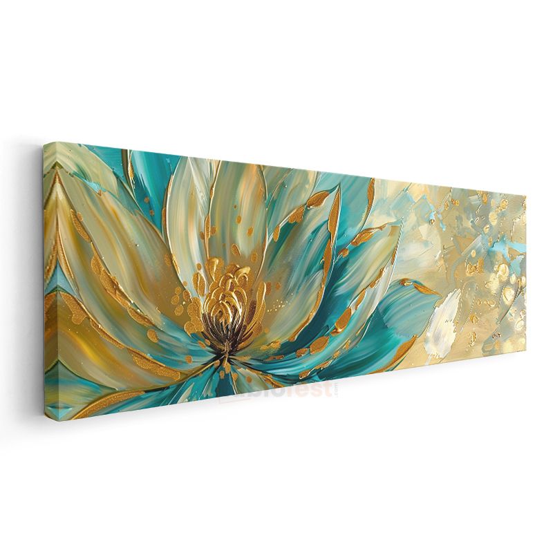 Turkuaz Nilüfer - Altın Detaylı Yağlı Boya Tarzı Çiçek Kompozisyonu Kanvas Tablo