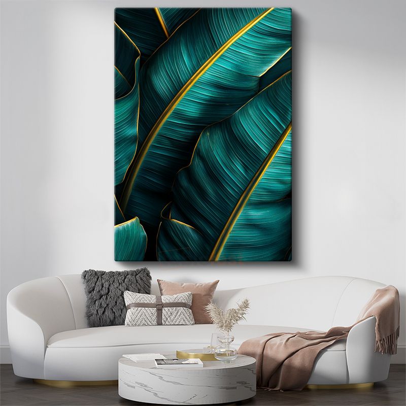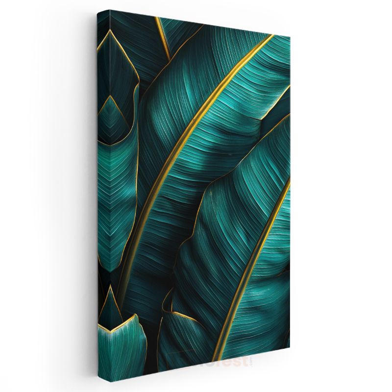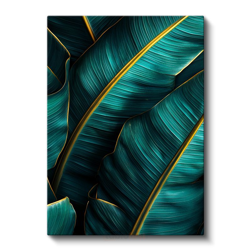 Turkuaz Yapraklar - Altın Damarlı Tropikal Bitki Deseni Kanvas Tablo