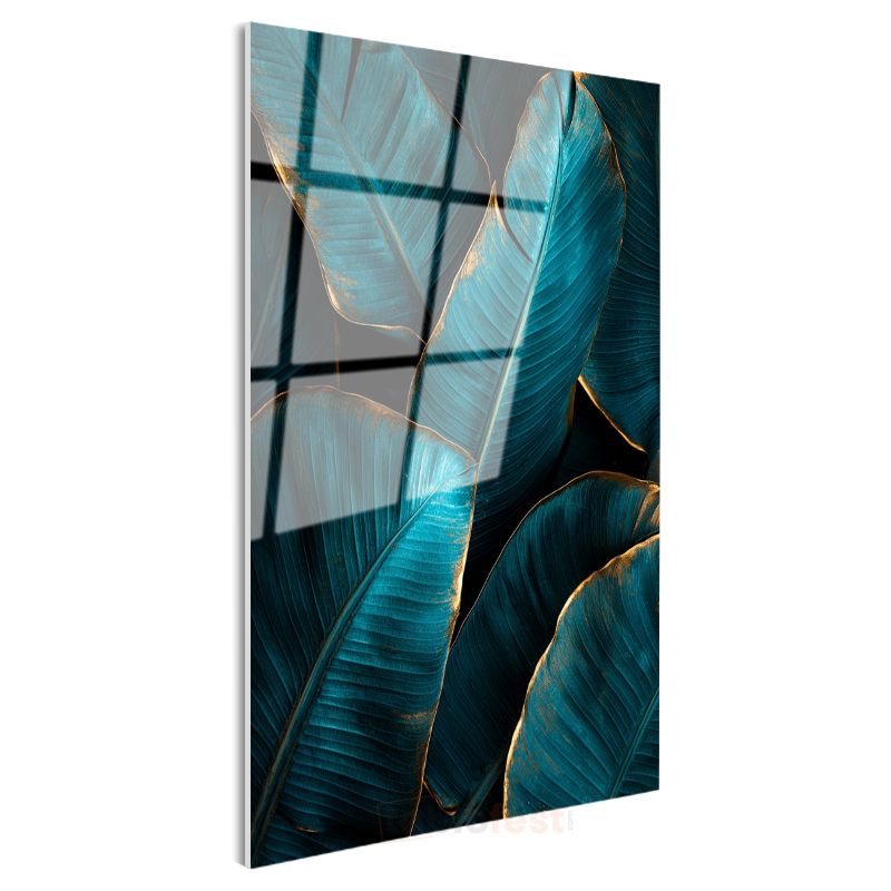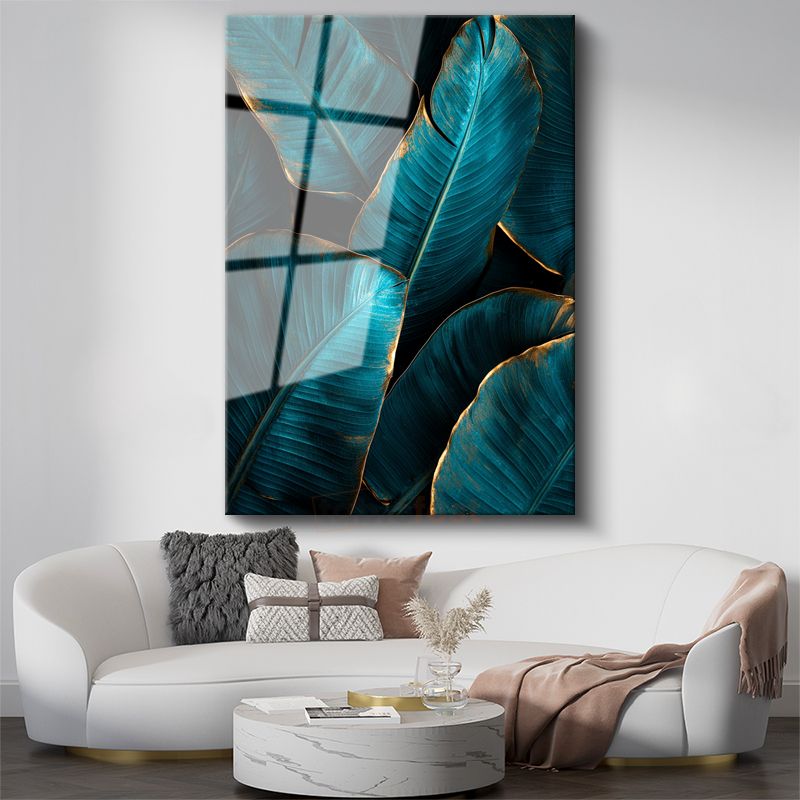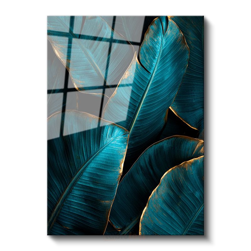 Turkuaz Yapraklar - Altın Detaylı Tropikal Bitki Cam Tablo