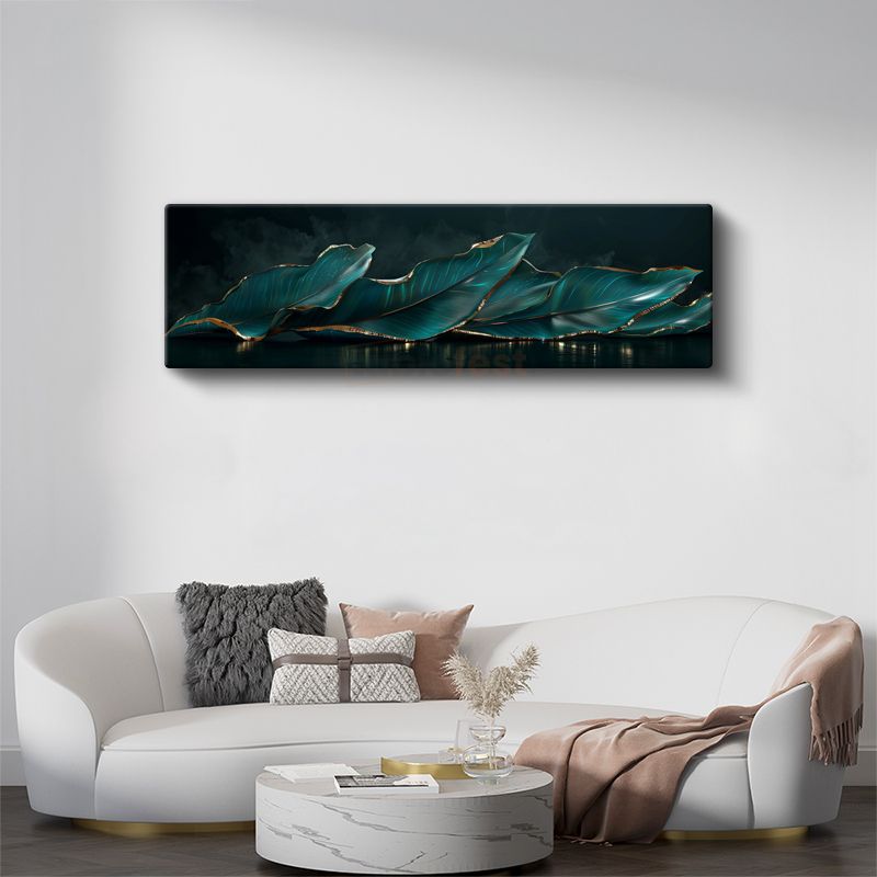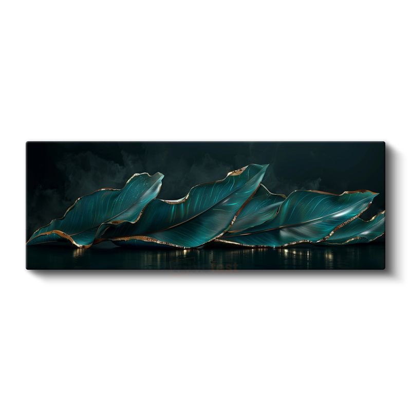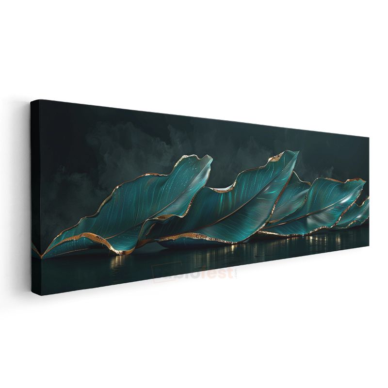 Turkuaz Yapraklar - Altın Kenar Detaylı Modern Botanik Tasarım Kanvas Tablo