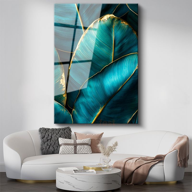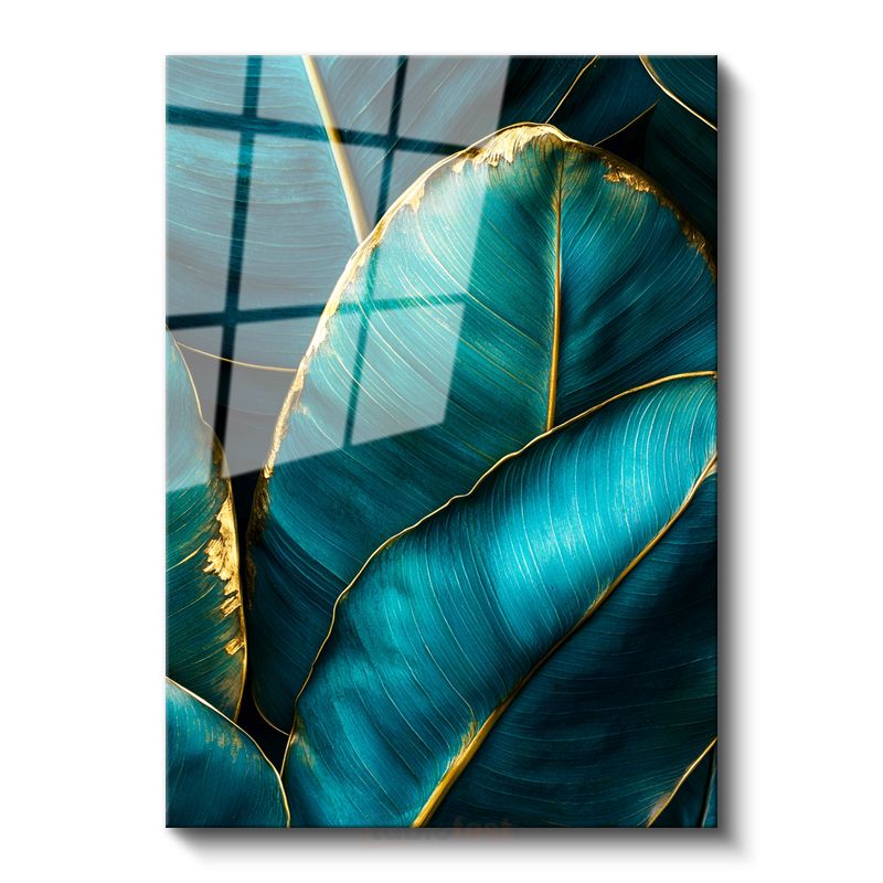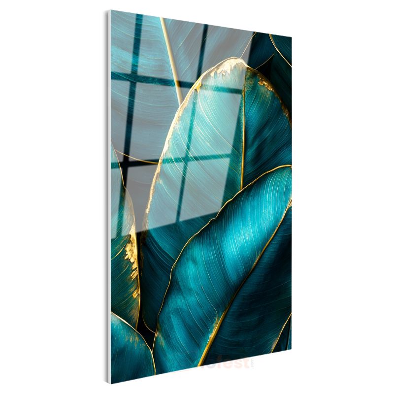 Turkuaz Yapraklar - Altın Kenarlı Tropikal Desen Cam Tablo