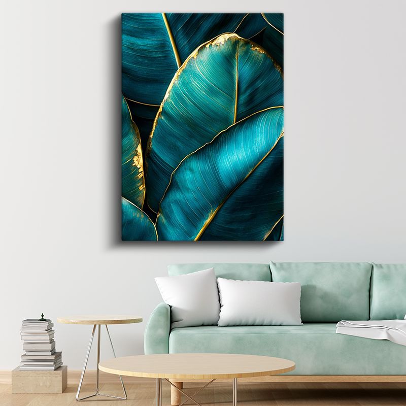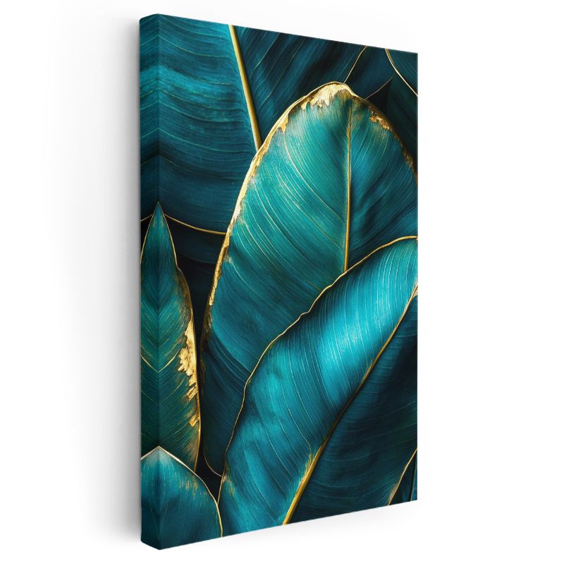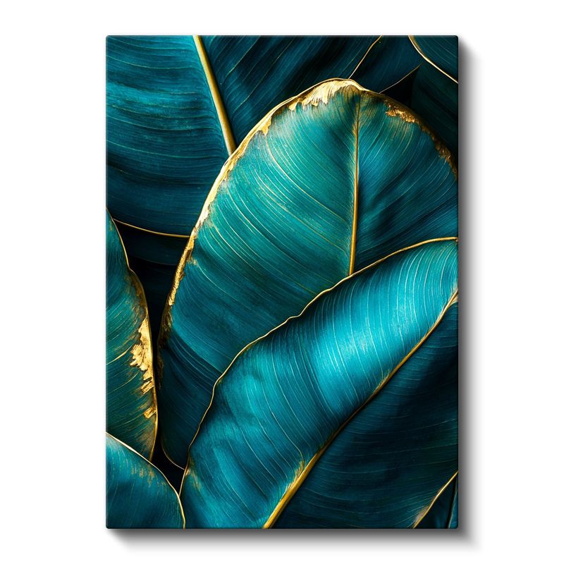 Turkuaz Yapraklar - Altın Kenarlı Tropikal Desen Kanvas Tablo