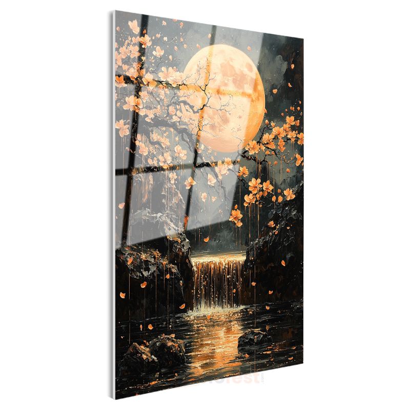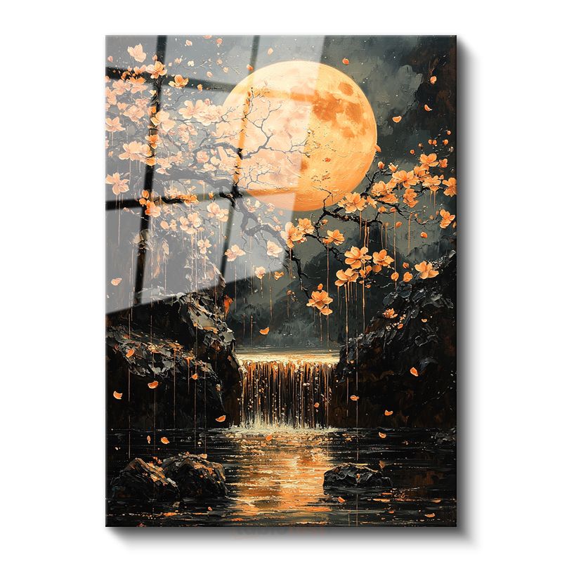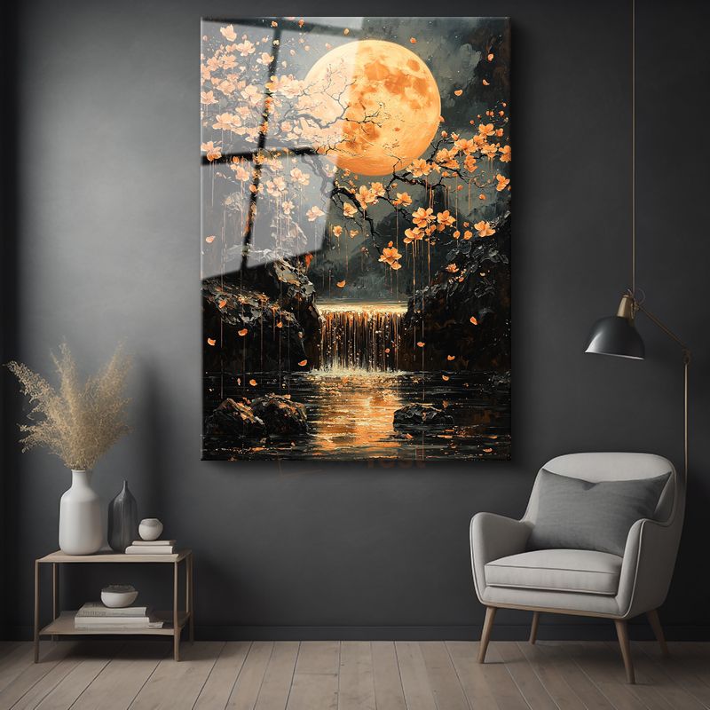 Turuncu Ay - Çiçekli Şelale ve Mistik Işık Cam Tablo