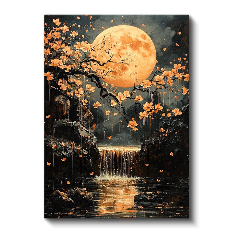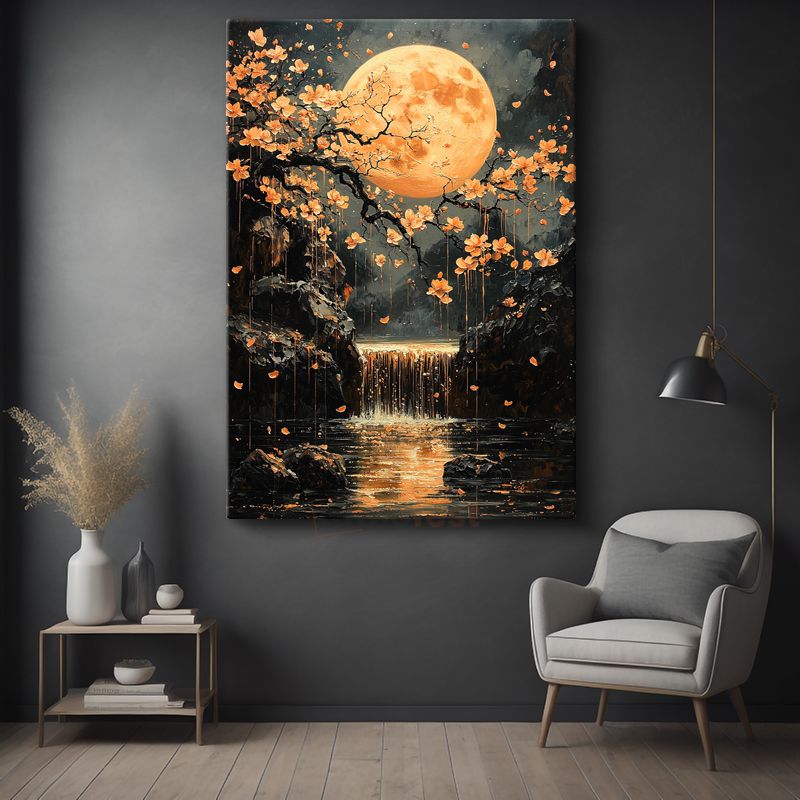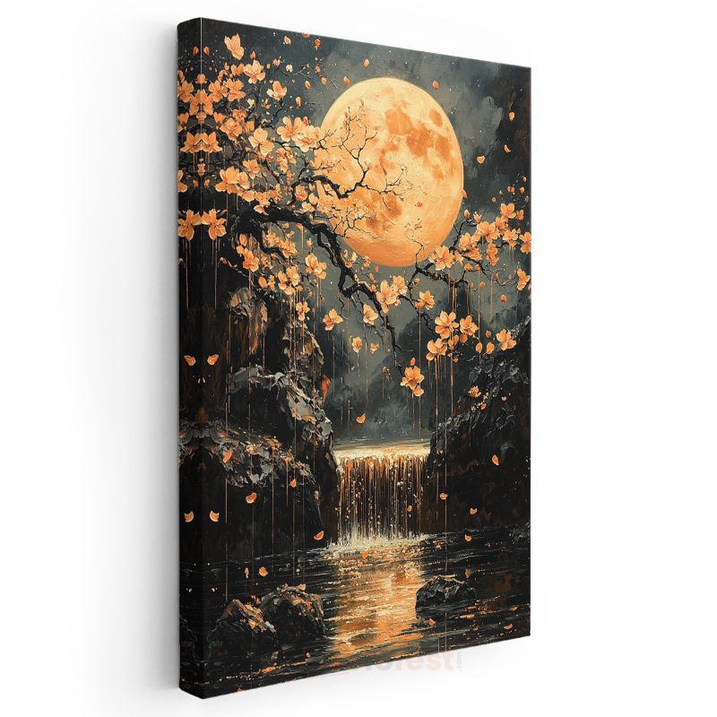 Turuncu Ay - Çiçekli Şelale ve Mistik Işık Kanvas Tablo