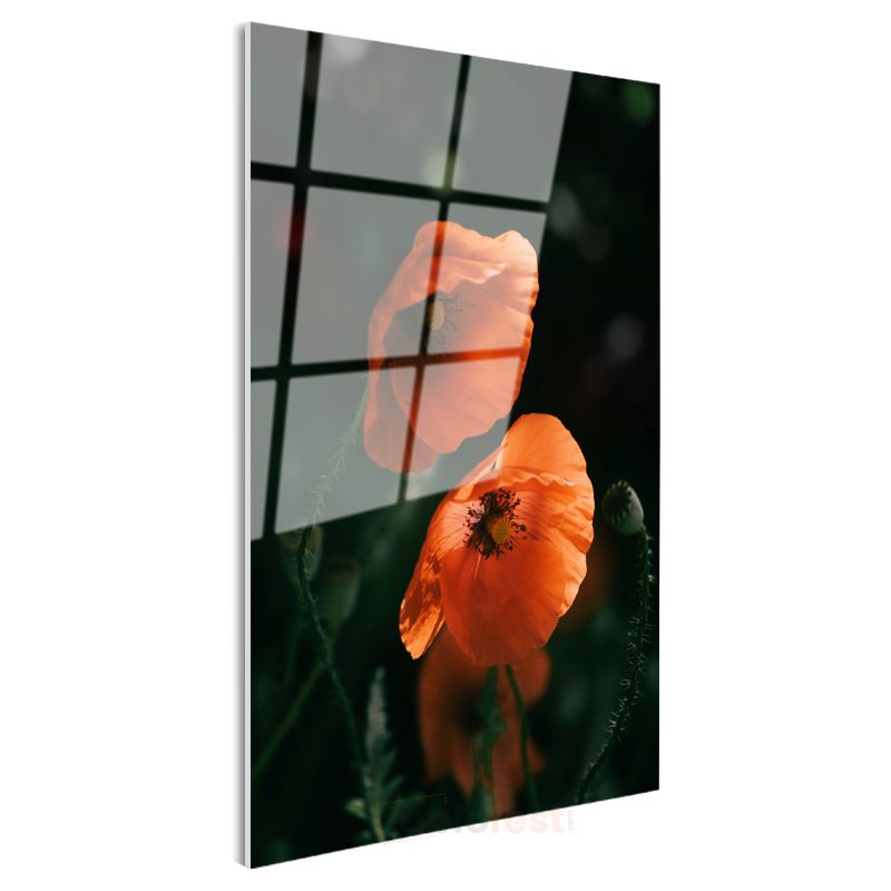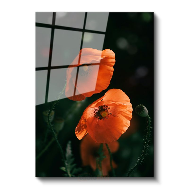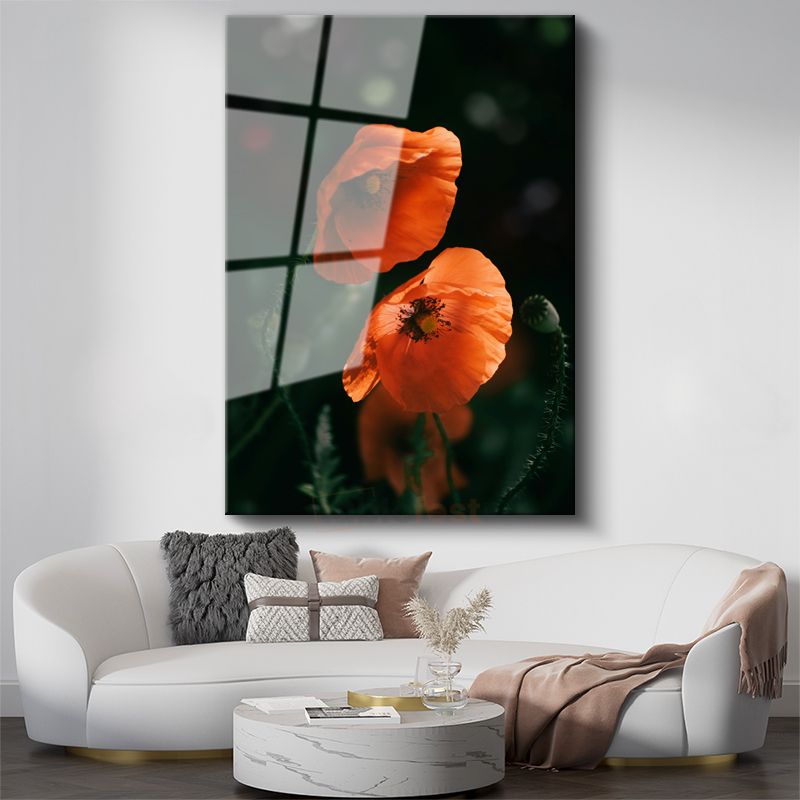 Turuncu Gelincikler - Koyu Zeminde Parlak Haşhaş Çiçekleri Cam Tablo